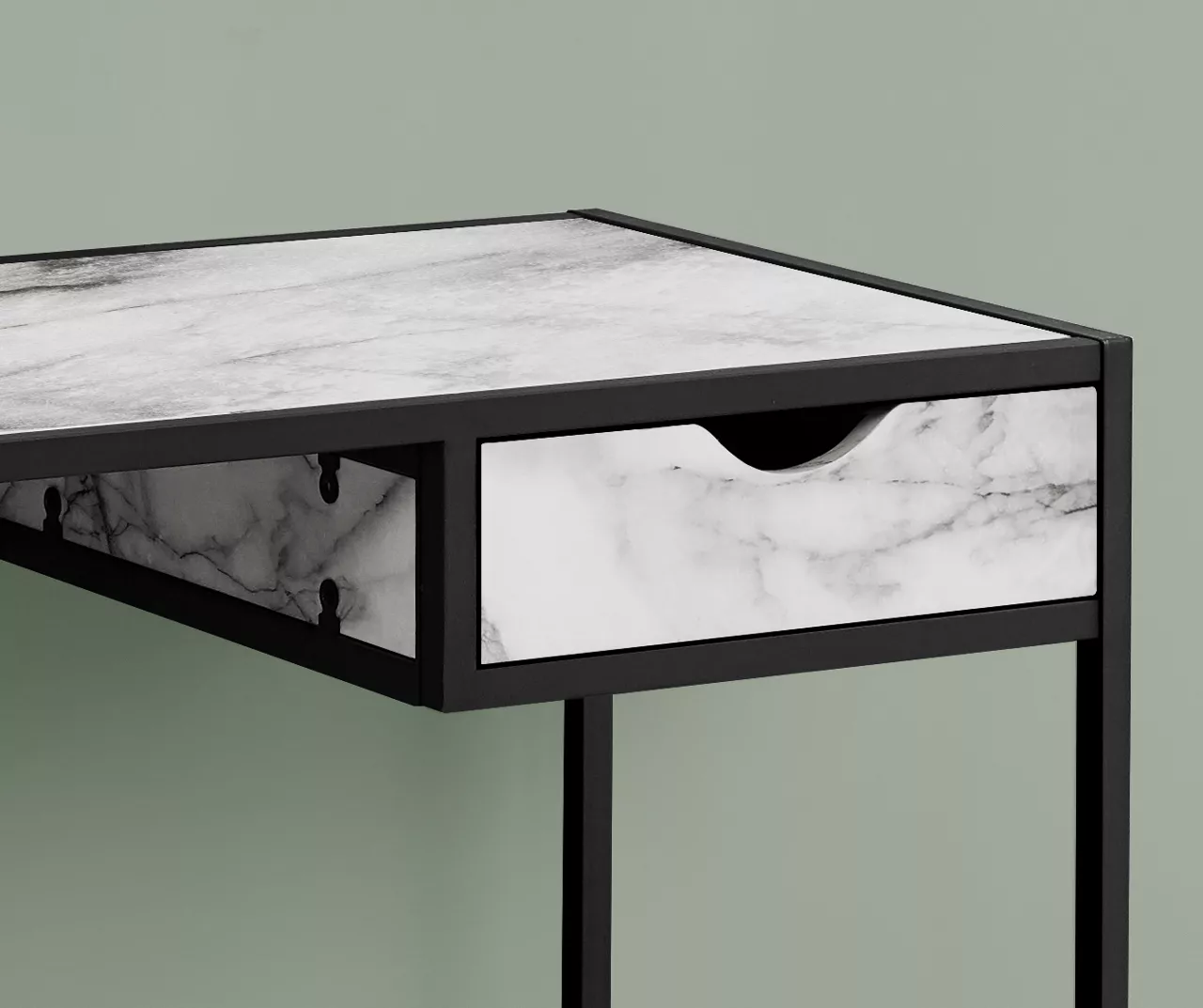 This computer desk with one storage drawer delivers stylish simplicity in a space-saving design. The desktop offers room for a laptop and the essentials you need to get work done. On the right, a storage drawer provides a convenient place to keep small supplies within easy reach. The drawer interior is finished in the same black marble-look laminate as the desktop panel and drawer exterior for a clean look. A slim yet sturdy metal frame in a black finish outlines the desktop and storage drawer for a modern-industrial touch. The compact size makes it a great choice if your home office space is in a living room or bedroom.