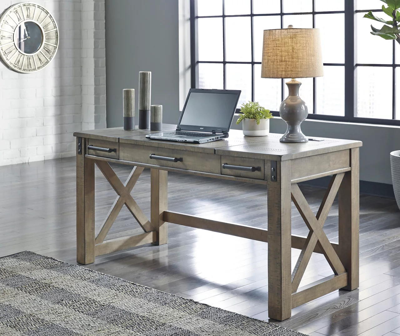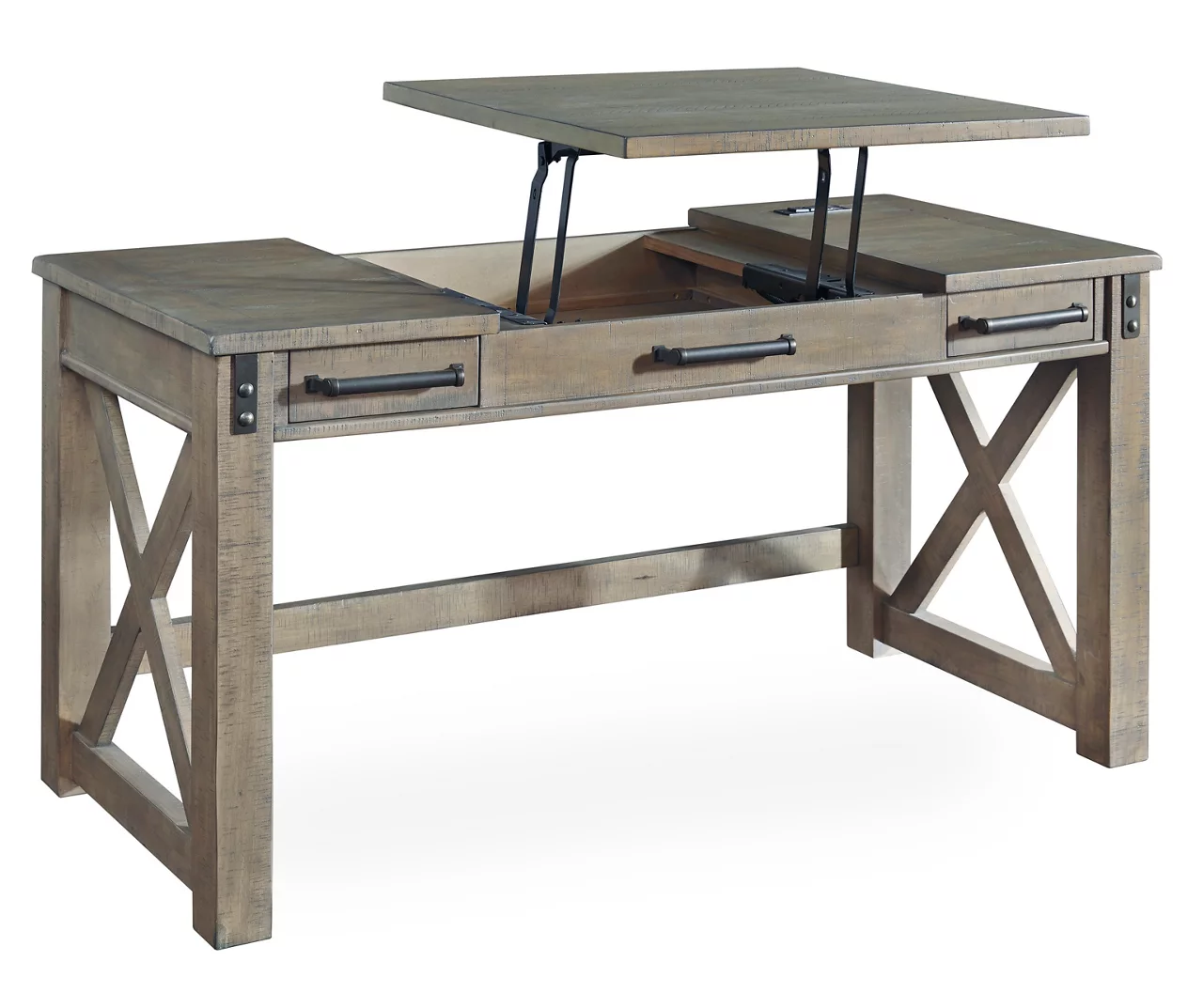 Crafted with pine veneers and wood treated to a distressed gray finish, this lift-top desk is rustic farmhouse living at its best. Crossbuck styling adds striking flair, while metal brackets incorporate an industrial twist. Elevating the functionality of this lift-top desk all the more are its two smooth-gliding drawers and conveniently placed AC power/USB plug-ins.