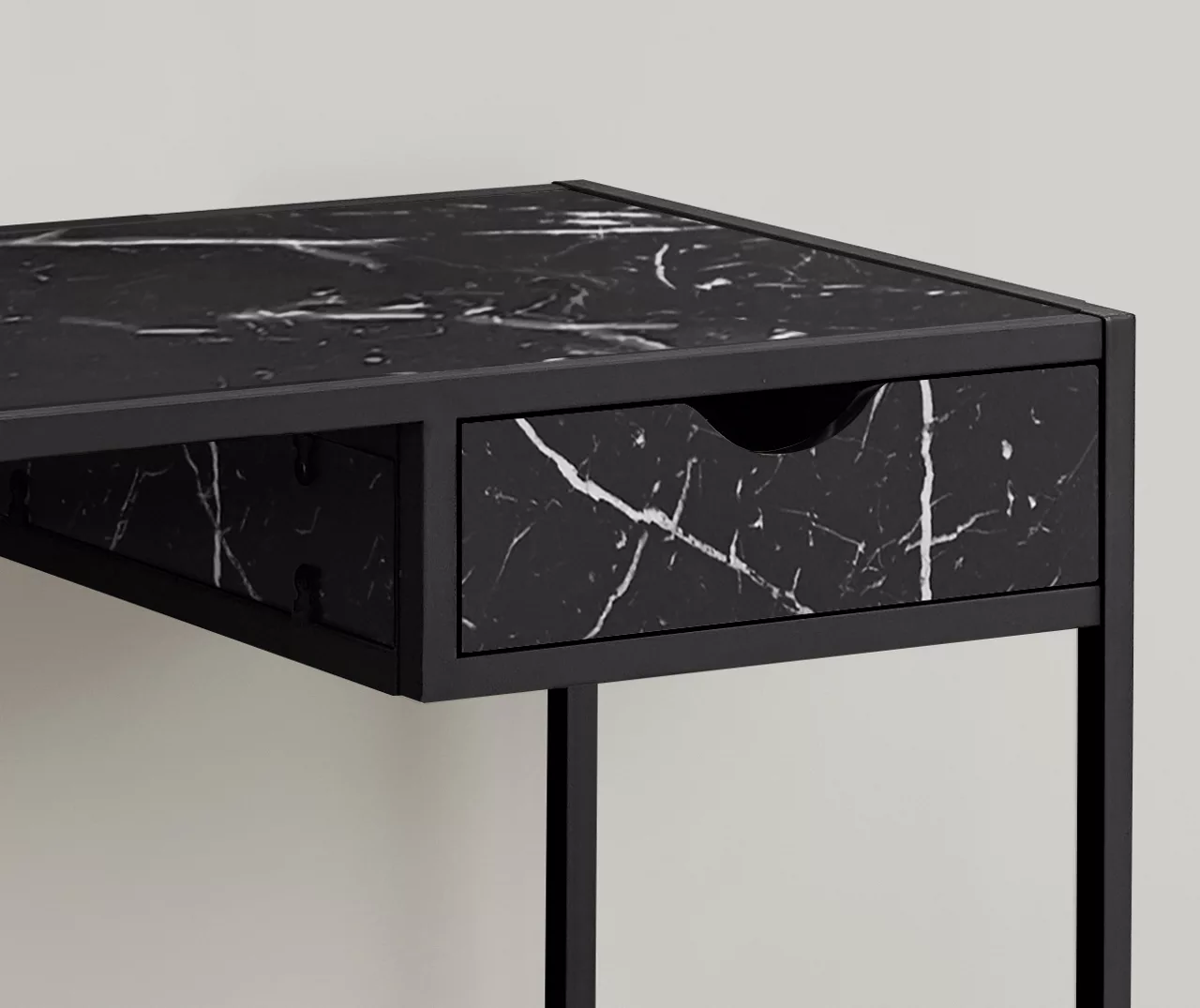 This computer desk with one storage drawer delivers stylish simplicity in a space-saving design. The desktop offers room for a laptop and the essentials you need to get work done. On the right, a storage drawer provides a convenient place to keep small supplies within easy reach. The drawer interior is finished in the same black marble-look laminate as the desktop panel and drawer exterior for a clean look. A slim yet sturdy metal frame in a black finish outlines the desktop and storage drawer for a modern-industrial touch. The compact size makes it a great choice if your home office space is in a living room or bedroom.