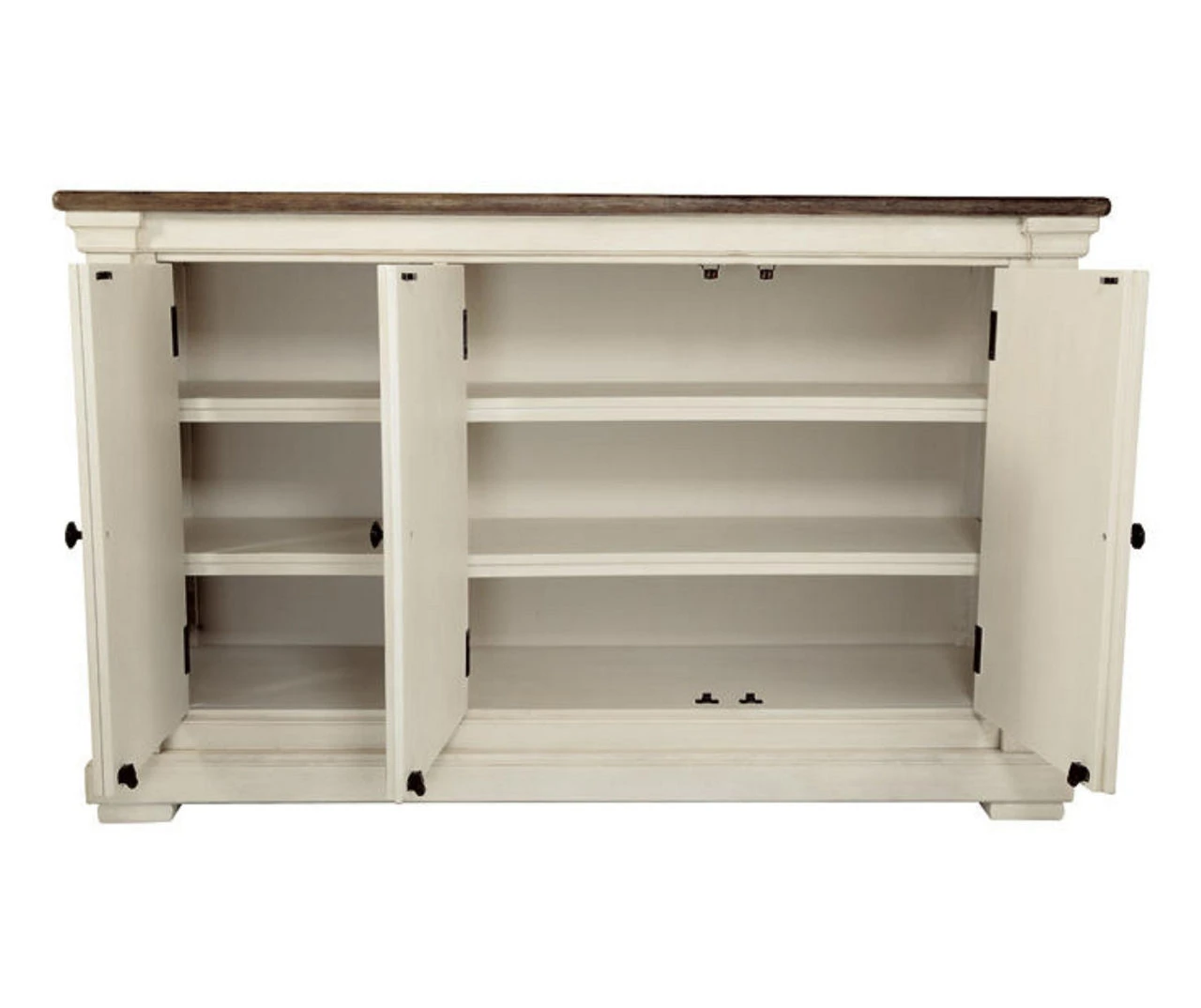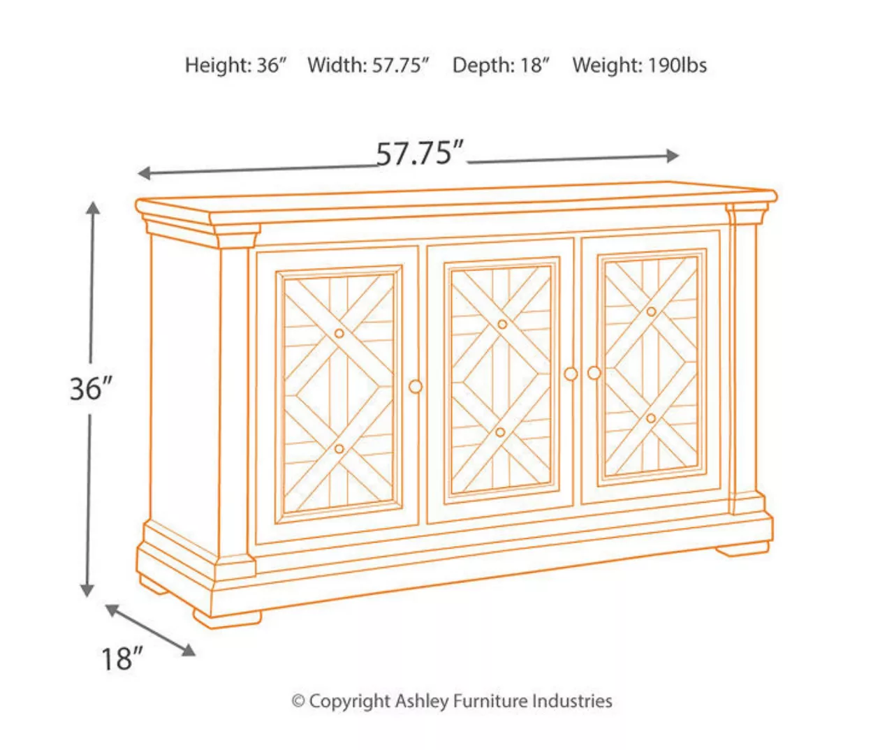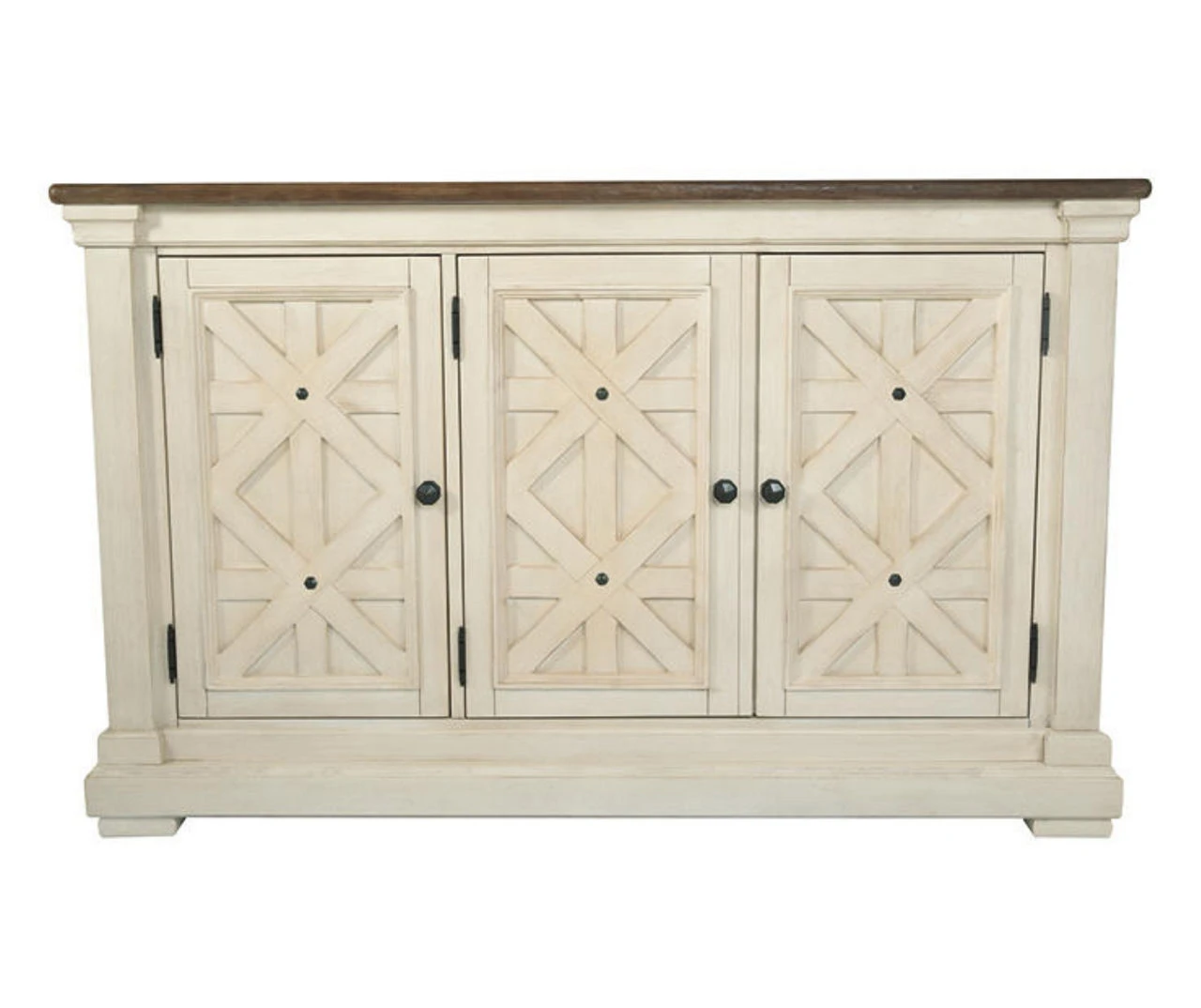 Need a stylish space to store dinnerware and all your dining room essentials? This server is a dream come true with two adjustable shelves that offer large capacity and a spacious top that’s perfect for setting a buffet. Embellished with the casual appeal of three latticed doors, an attractive planked top with a weathered oak finish and a lightly distressed white finish throughout, this vintage look will serve up elegance for years to come.