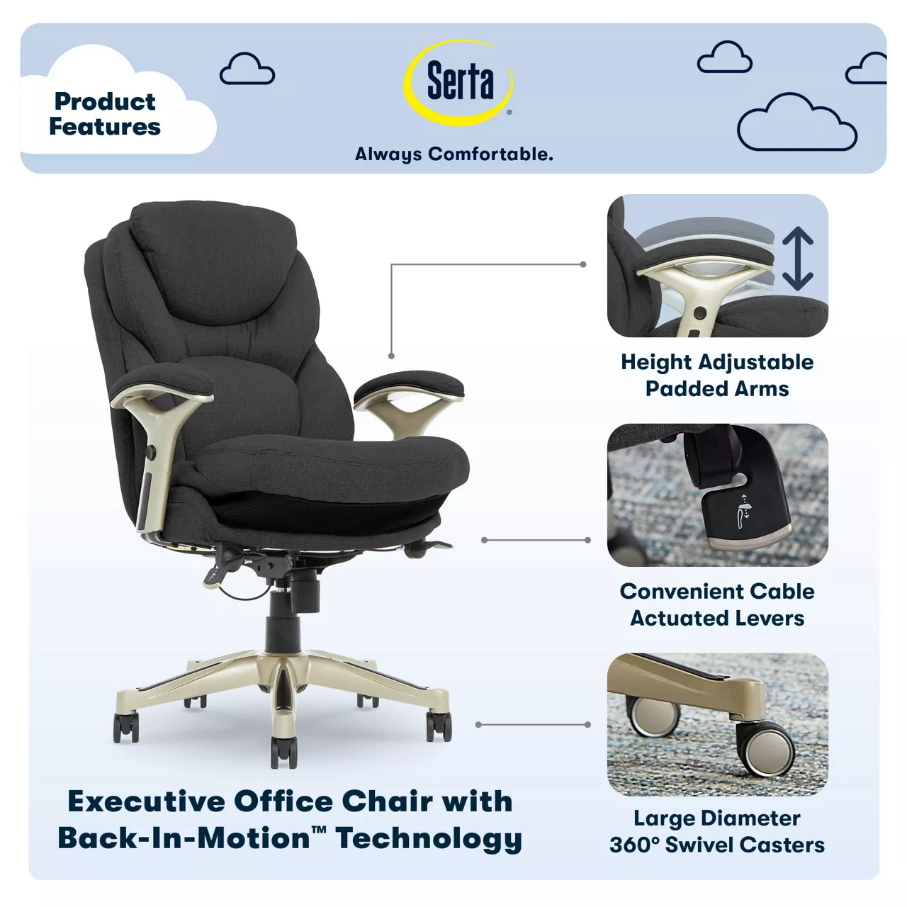Help promote strength and flexibility in your back while you work with the Serta Back in Motion Executive Office Chair. This ergonomic office chair helps users become more productive and efficient by maximizing lower back support and comfort while seated. Its unique Back in Motion Active Seat Technology swivels the lumbar forward, providing the same effects as a pelvic tilt exercise by promoting spinal movement and flexibility in your core. Push-button adjustable armrests and pneumatic height adjustment allow the fabric office chair to be quickly and easily customized to find the right fit for you. The multi-layered cushions are soft yet supportive, so you’ll feel refreshed even after a long day.