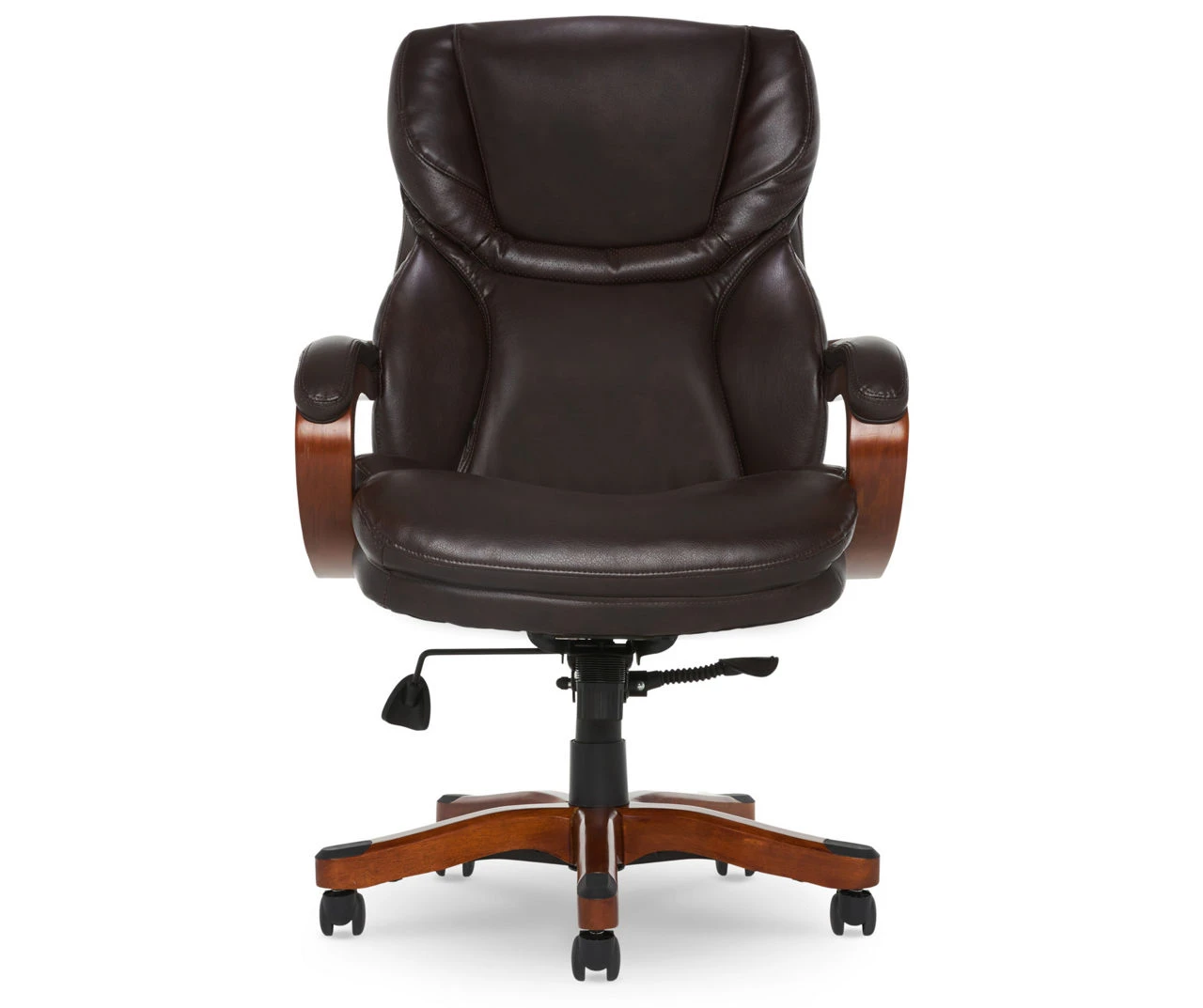 Create a powerful and commanding presence in your office with the Serta Conway Big and Tall Executive Office Chair. This corporate office chair is specifically designed to deliver proper strength and support for those with larger frames. It features an adjustable lumbar panel that provides the support you need for long hours at the office, with ergonomic height and tilt adjustments that let users find and lock in the perfect position. Quality bonded leather and authentic wood accents exude an executive presence, while layers of thick, pillowy cushions offer first-class comfort. Strong, sturdy and dependable, this adjustable leather office chair makes a confident statement while keeping you comfortable and supported.