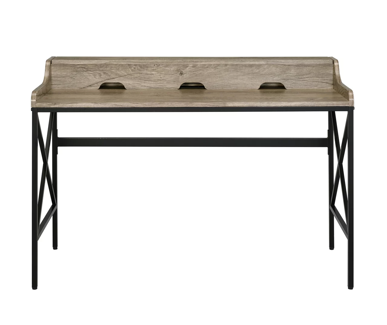 Modern rustic styling for today’s offices or homes, the Corday desk combines a gray wood look with black metal accents in a desk that adds storage and style to any room. An enclosed back panel offers hidden storage for all your messy computer peripherals while easy-open access and dual USB ports and an electrical outlet offer easy charging for devices. The style and utility of the Corday desk provides a compact footprint that will fit well in an apartment or large home.