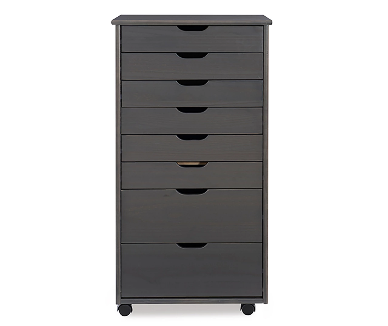 Blending versatility with simple, classic lines, this storage cart makes organizing any busy home or office a breeze. Six equally sized drawers and two larger drawers offer ample space for craft supplies, toys or accessories while wheeled casters ensure easy mobility around the space. The soothing gray finish brings warmth and visual interest to the piece. Drawers are removable for added convenience.