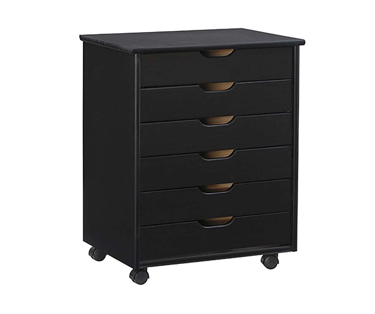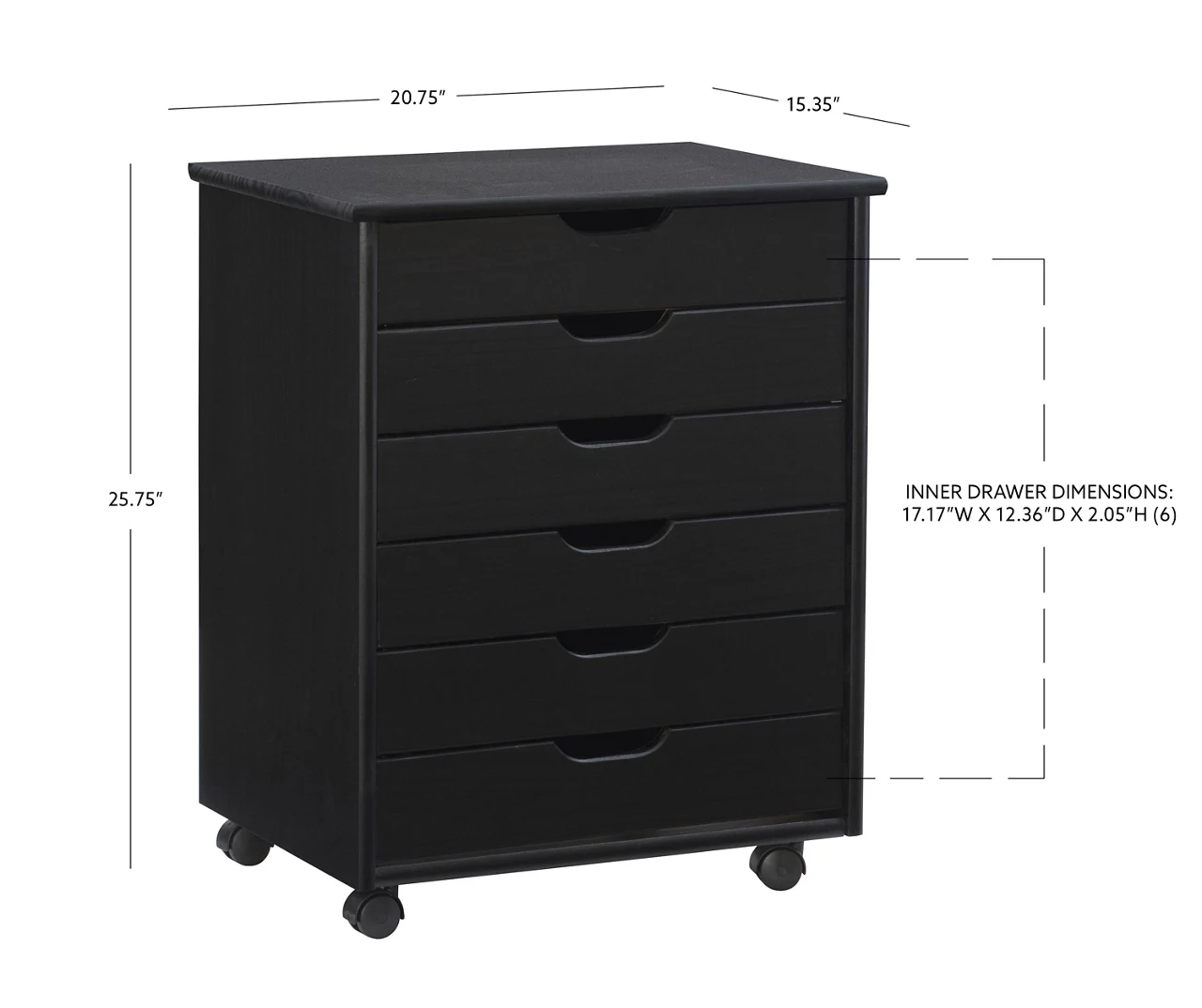 This six drawer rolling storage cart is a versatile storage solution for your office, kitchen, bedroom or anywhere where organization is needed. Solidly constructed from pine wood and finished in a handsome black, the six wide, equal size drawers are finished off with an ample top that can go next to a desk or craft table to put items within reach. Soft contoured handle cut outs are easy on the touch and create a clean, modern look. Drawers can be easily removed and used as a tray to transport your items to your workspace, while casters make this piece mobile to go into any room easily.