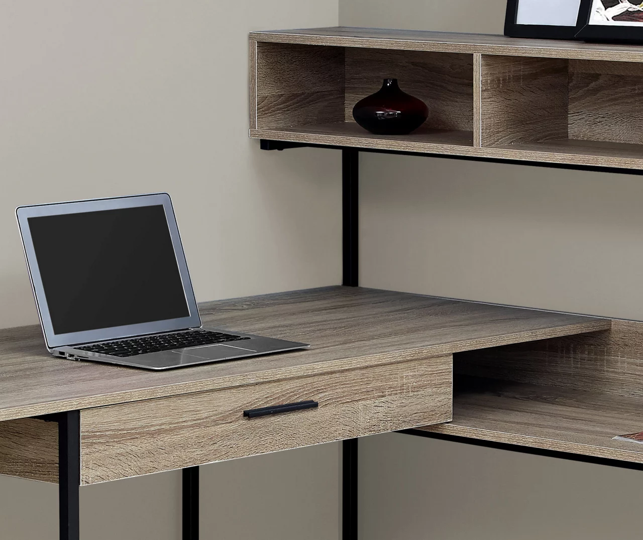 Let this L-shaped corner desk inspire you with its practical and modern industrial aesthetic. It starts with a smooth laminate finish on all sides in a chic dark taupe woodgrain finish accented with strong black metal framing. The numerous storage options include a wide drawer on metal glides with a sturdy black handle alongside an open cubby and two fixed bottom shelves for books, magazines or even a small printer. The side station is so useful with three spacious cubbies on top for all your work essentials.