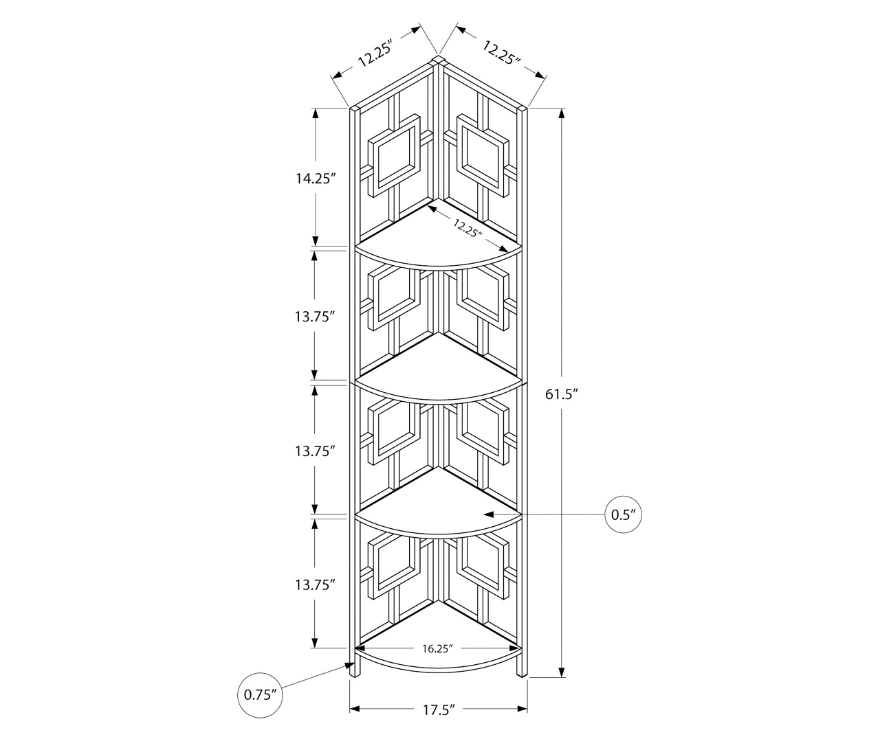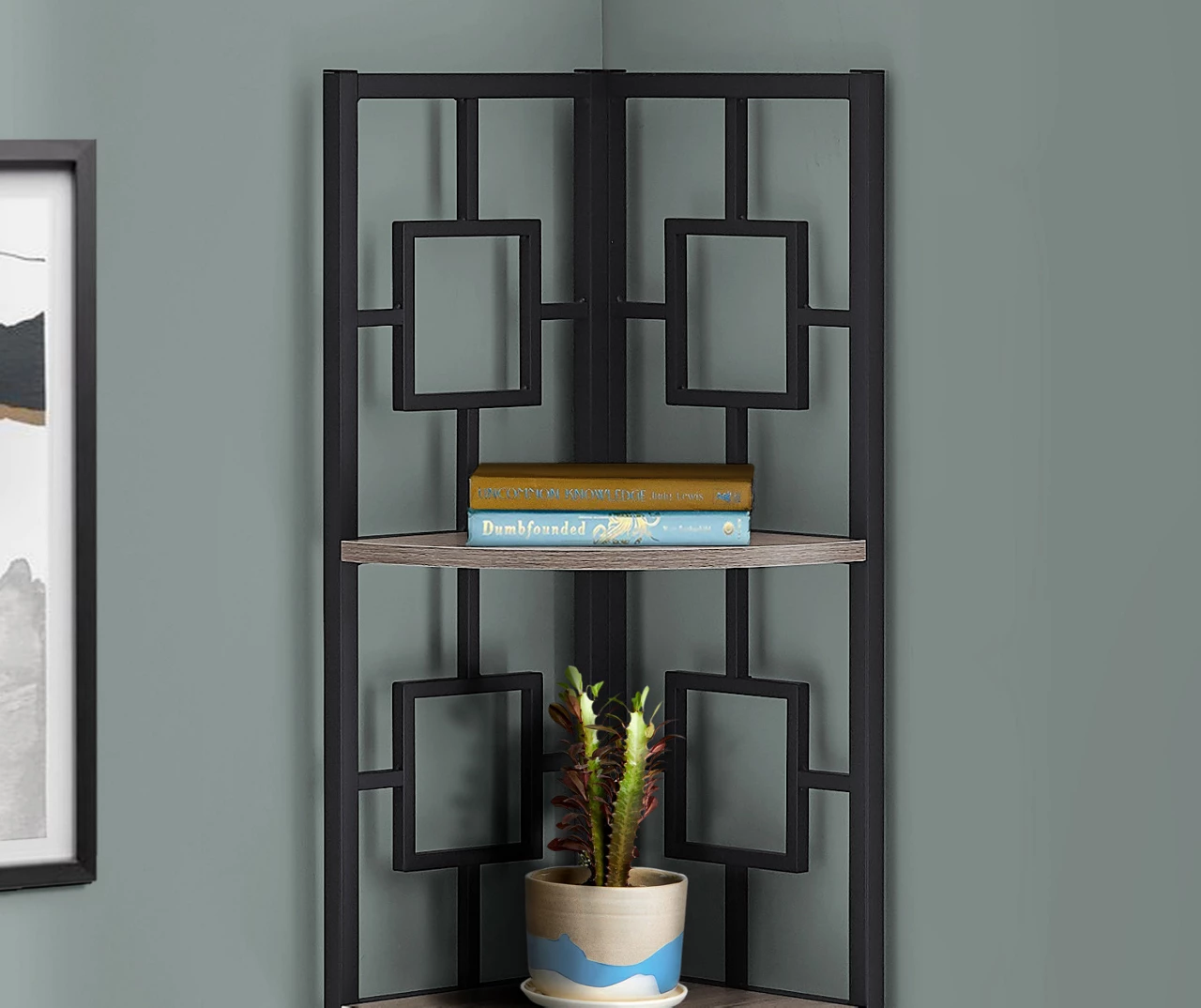 Perfect for photo frames, plants, other decorative items and even kitchen accessories, this transitional-style corner bookcase will upgrade your décor. Including four dark taupe display shelves, this corner display unit features a three-leg black metal frame and a square design that will add modern flair wherever you choose to place it.