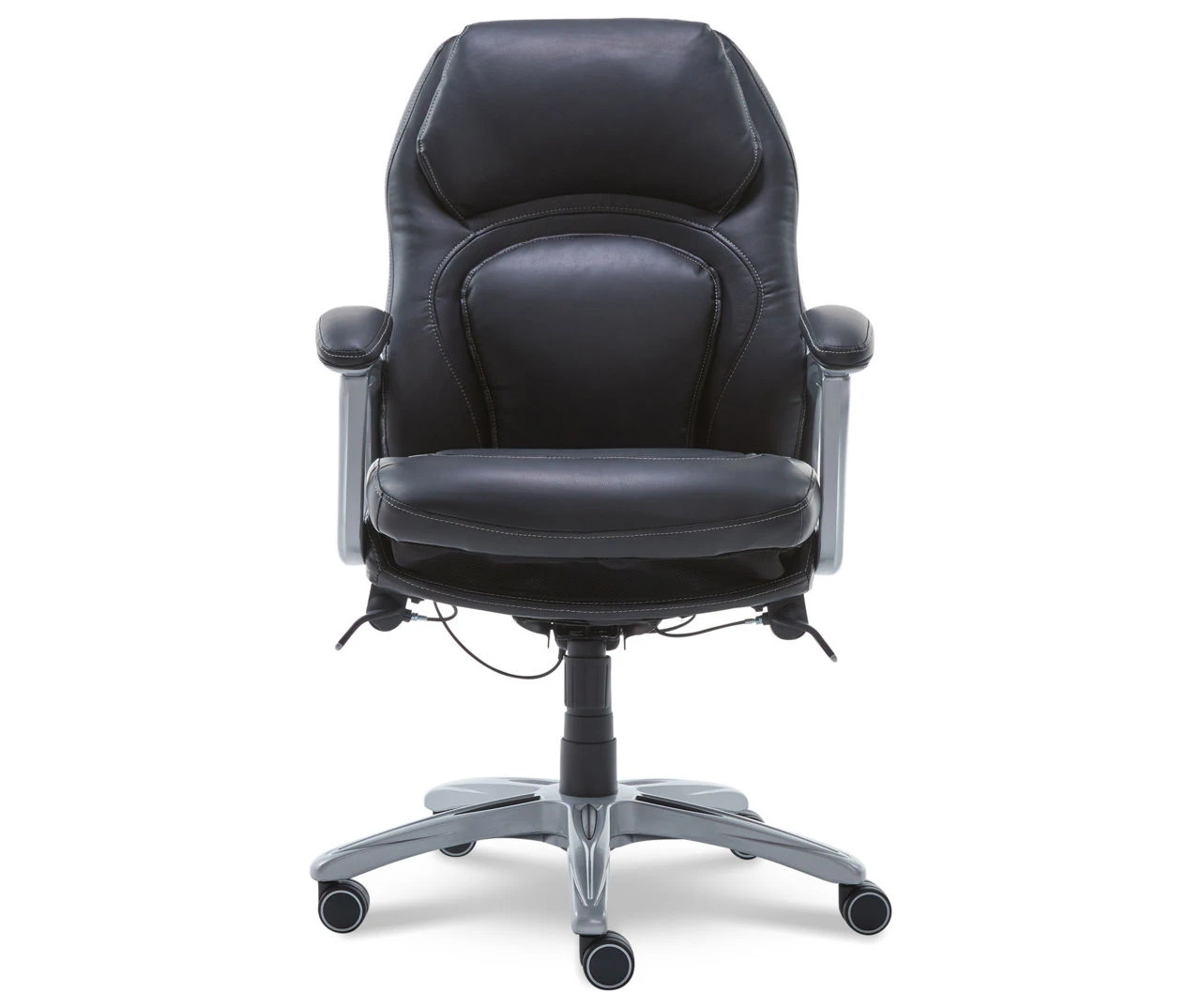 Enjoy the comfort of a seat primed for wellness with the Serta Wellness by Design Delvin Executive Office Chair. This innovative desk chair features Back in Motion Active Seating Technology, which corrects your posture by tilting your pelvis forward when you lean, keeping your spine in a neutral position. This ergonomic office chair helps you use proper body mechanics, reducing strain and stress while improving spinal health. It is designed with layered body pillows to provide optimal support and features heavy-duty caster wheels for smooth mobility.
