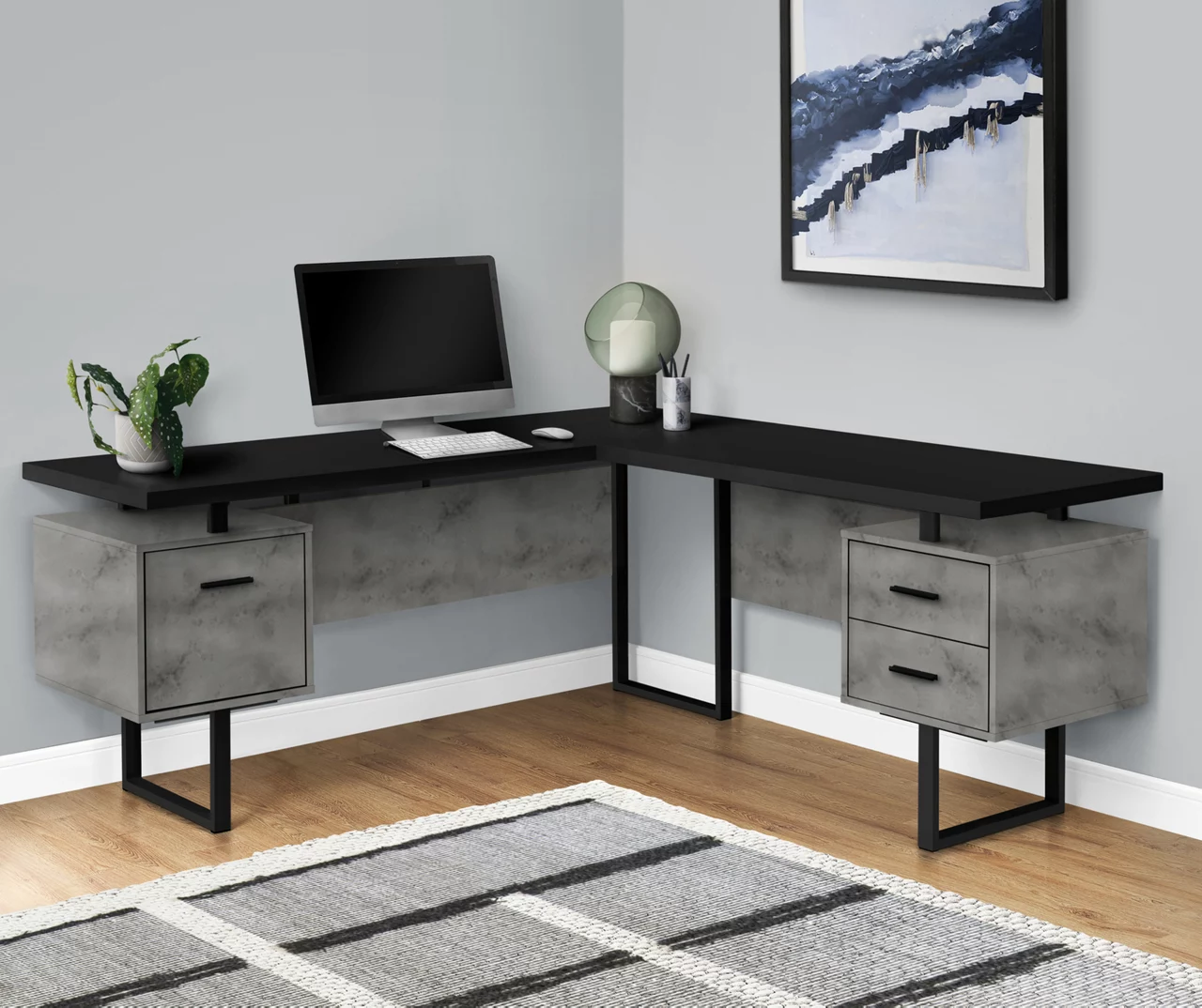Give your home office a promotion with this extra-large, corner computer desk with three storage drawers. Finished in a gray concrete-look laminate that contrasts the black desktop, this thick-panel, L-shaped floating desktop provides plenty of room for you to spread out everything you need to be productive. And, with two small drawers and one large drawer with a bar for hanging files, you’ll have tons of space for the items you want to keep off your work surface.