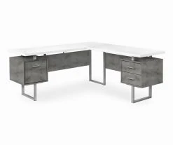 Give your home office a promotion with this extra-large, corner computer desk with three storage drawers. Finished in a smooth grey concrete-look laminate that contrasts the white desktop, this thick-panel, L-shaped floating desktop provides plenty of room for you to spread out everything you need to be productive. And, with two small drawers and one large drawer with a bar for hanging files, you’ll have tons of space for the items you want to keep off your work surface.