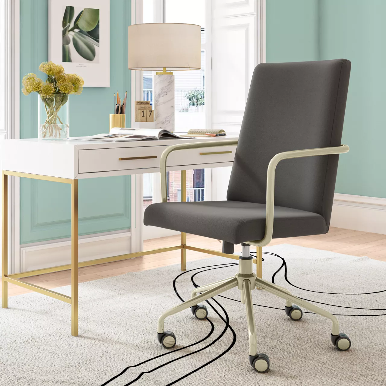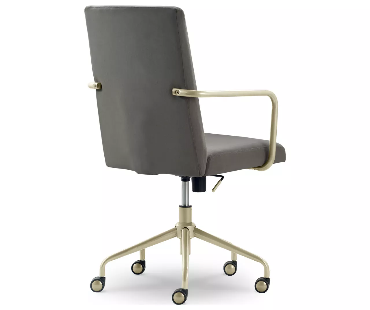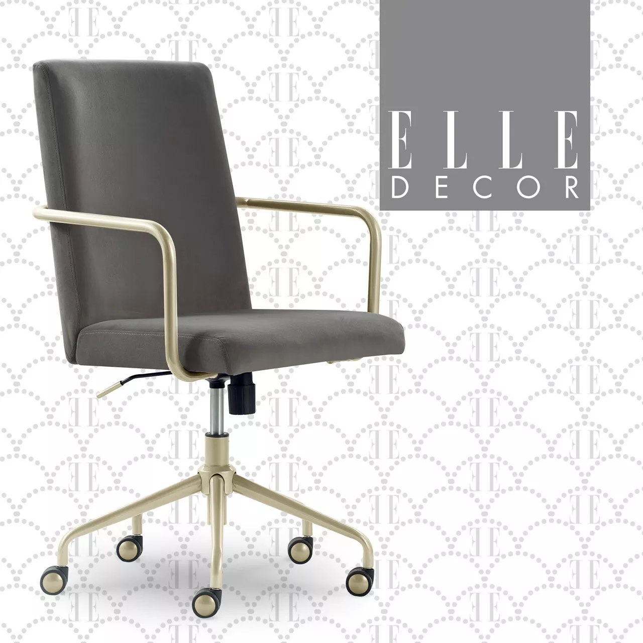 Transform any small, boring office into a cool, modern workspace with the Elle Decor Giselle Office Chair. This computer chair boasts plenty of features designed to make you feel like an executive while you’re hard at work or chatting with friends from the computer at your desk. The sleek chair fits right into a small or big room, elevating its surroundings thanks to the cute back, upholstered ergonomic seat cushion, and gold metal trim that goes from arm to base to wheels. This chair offers the ideal modern accent for your home office, bedroom, or vanity. From the buttery soft fabric to the flash of gold, this desk chair makes any room into a chic, creative space.
