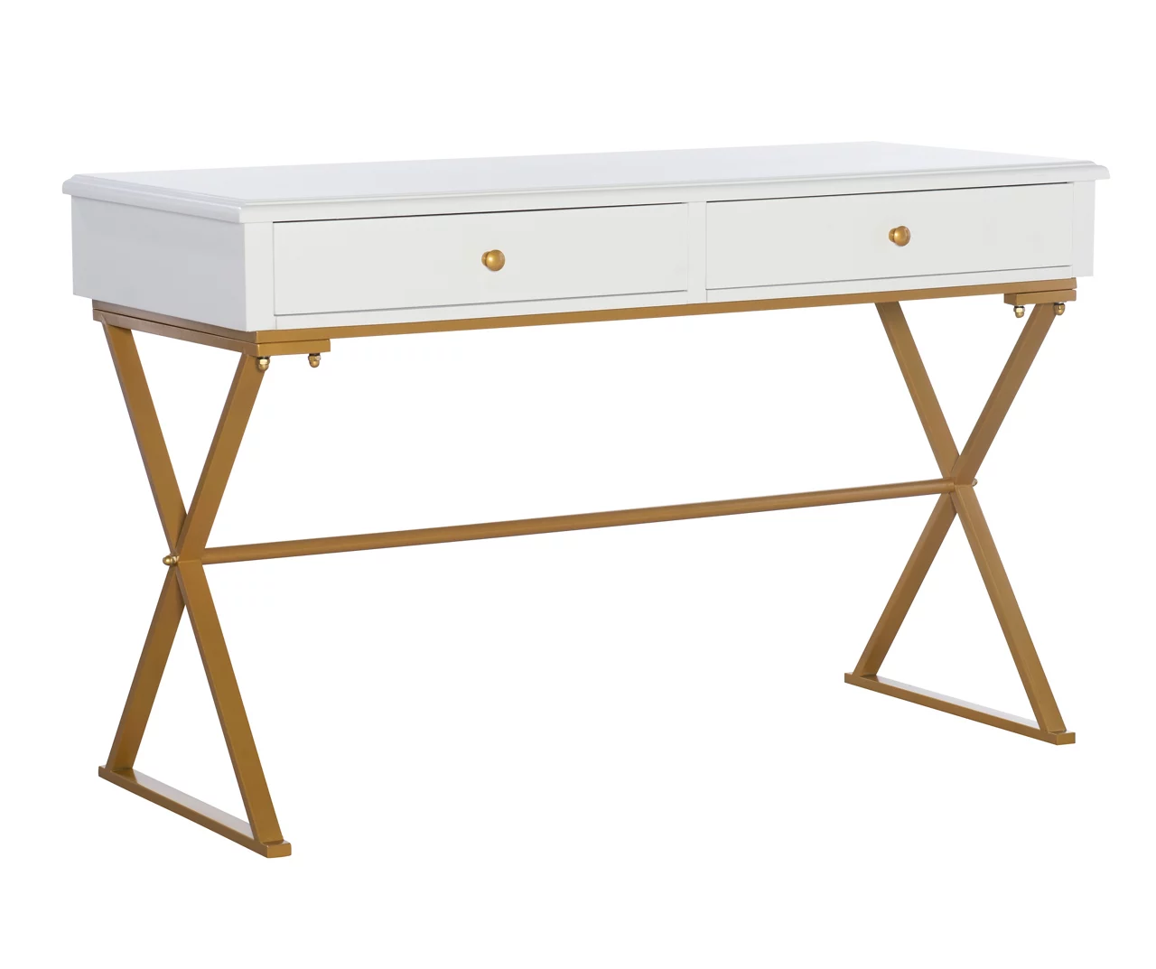 Incorporate stunning style into your home with this eye-catching desk. Versatile yet striking, this desk features a crisp gold finish that accentuates the sharp, trestle-style frame. The contrasting white top gives this piece a neutral yet chic effect. Top it with flowers, a lamp or framed photographs and this desk will inject style into an empty space or creates a dynamic workspace in a bedroom or living room.