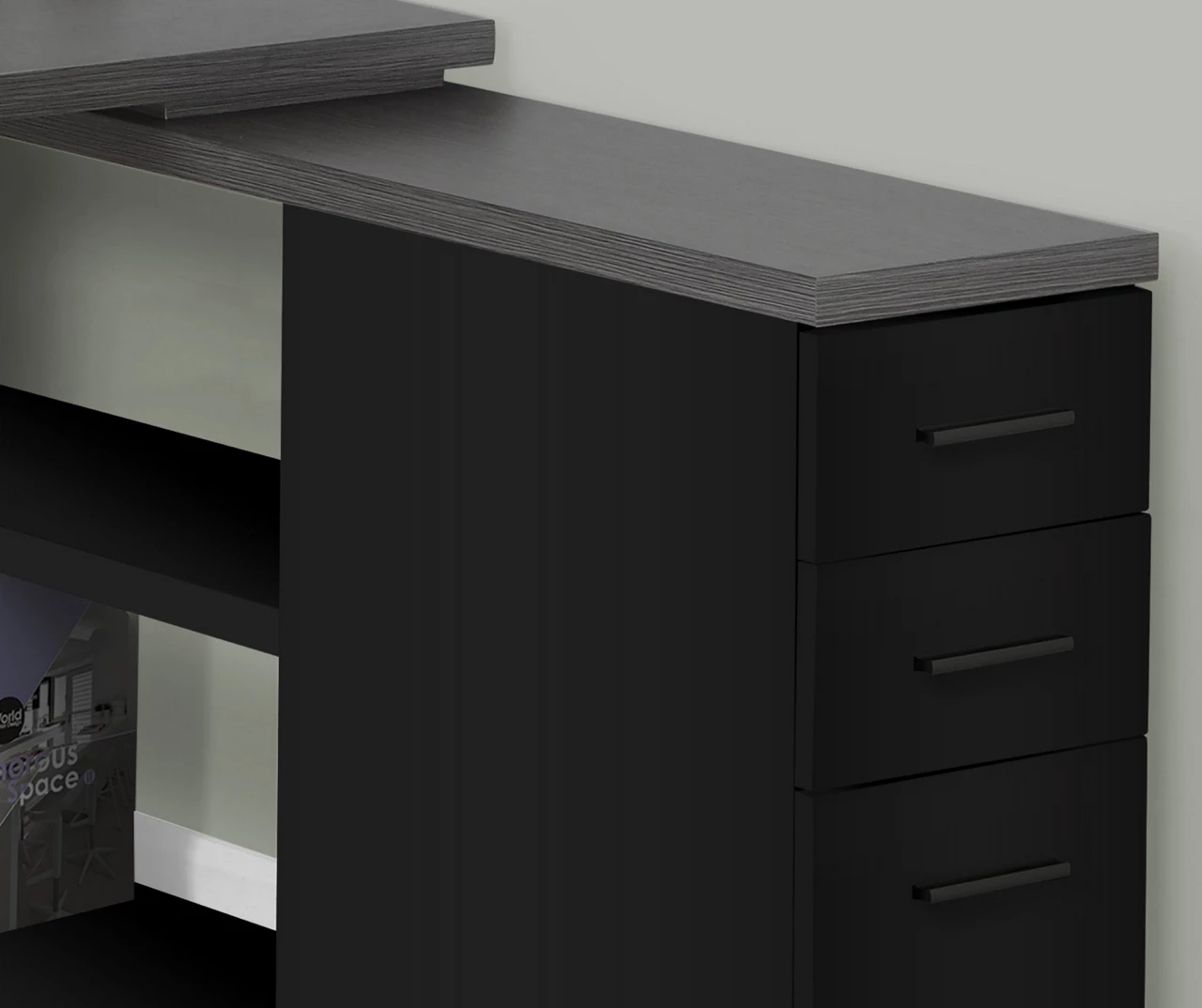 Versatile, contemporary and packed with storage compartments, this stunning L-shaped desk can be assembled on the left or right side, making it uniquely yours to customize. Designed with clean lines, thick panel construction and low track metal legs, it truly is the ultimate combination of form and function. The side surface offers an additional work space and is supported by an attached three-drawer console, including one file drawer. The black metal handles add to the desk’s sleek design appeal.