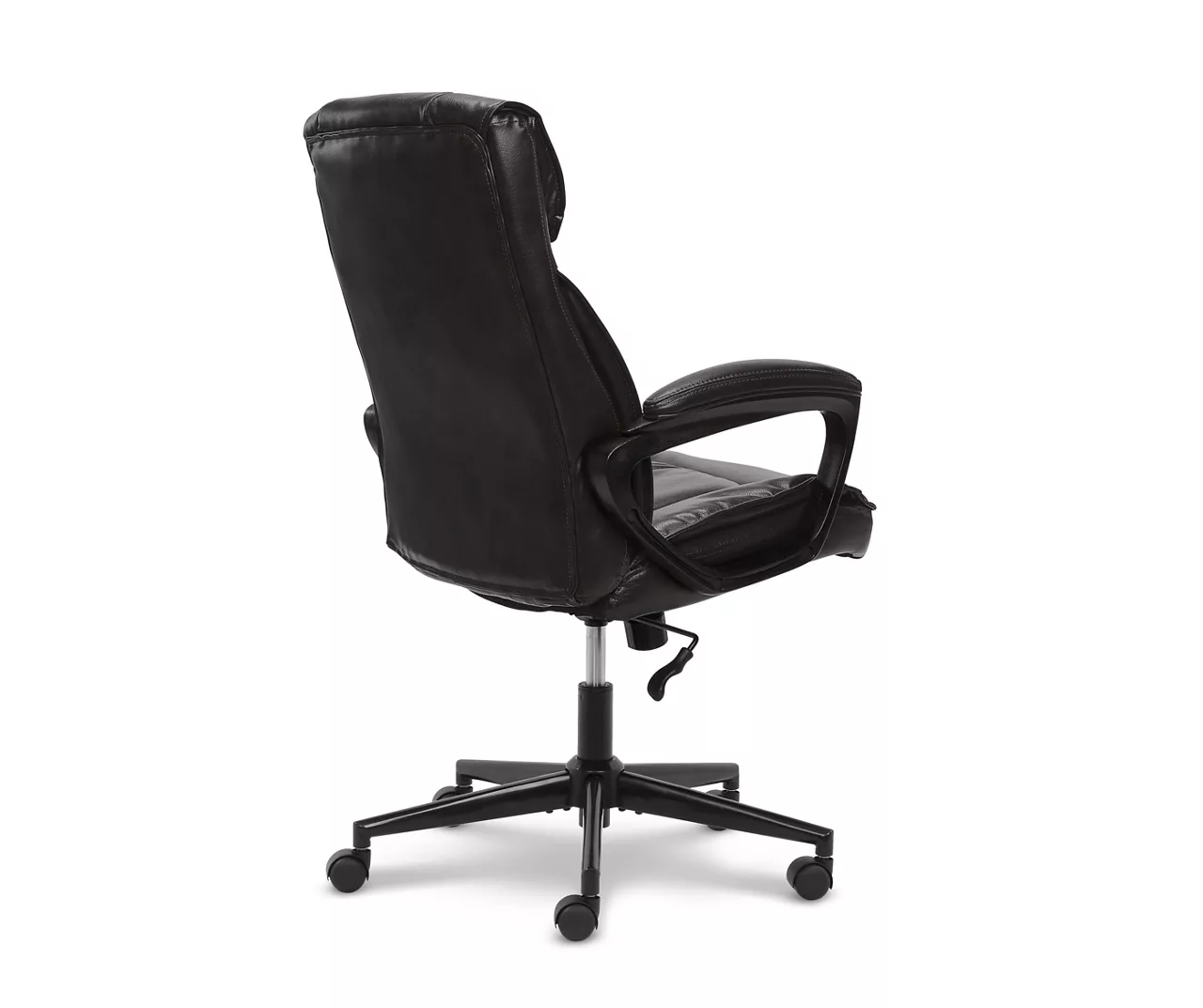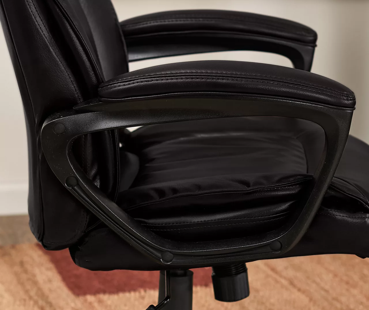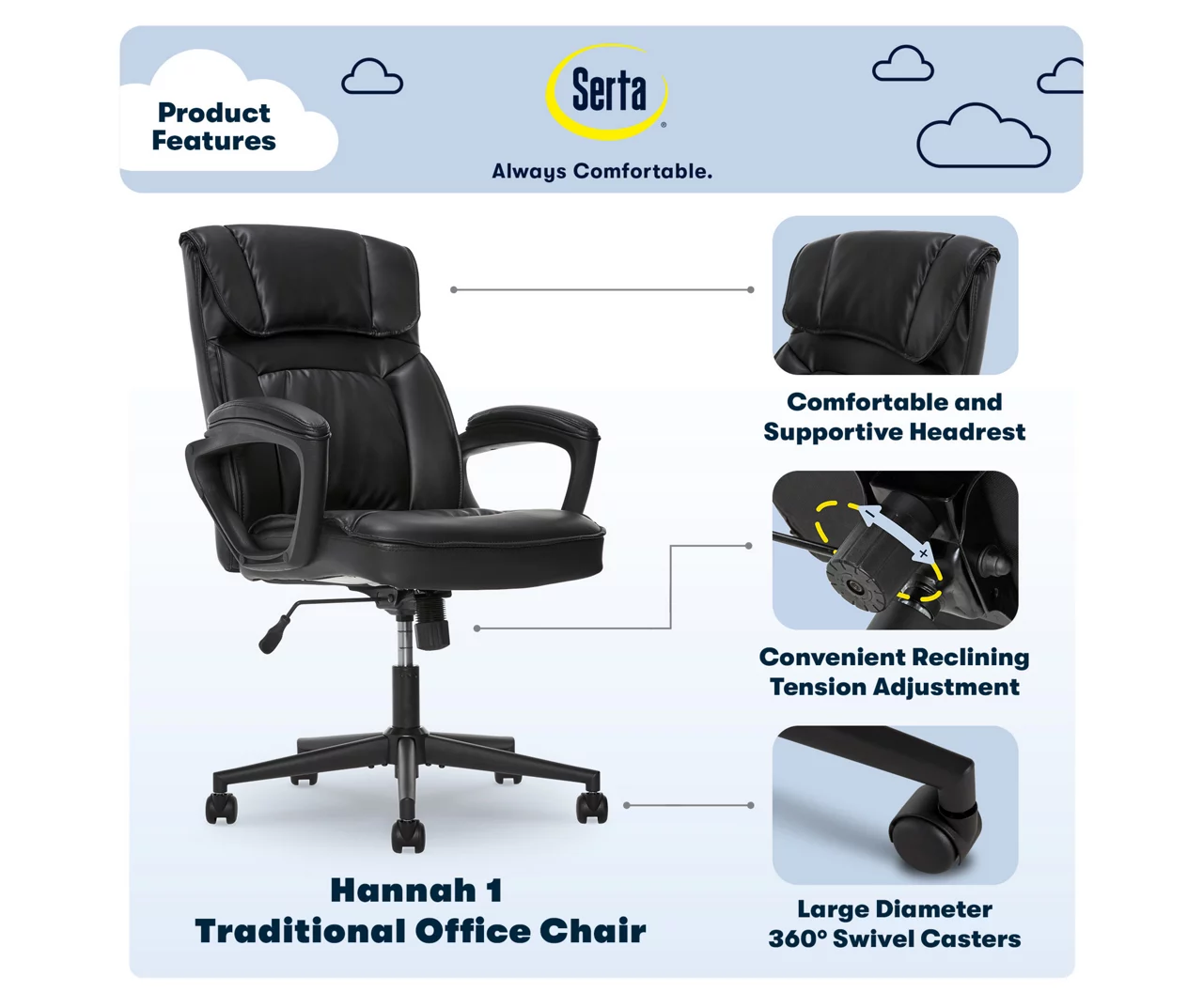 Get down to business in style with the bonded leather Hannah I office chair by Serta. With a cushioned, contemporary profile, its designed with comfort in mind with adjustable height and recline tensions. Its waterfall seat edge is curved to lessen back pressure and increase circulation. The design makes it suitable for many types of office decor, from modern to traditional. Its classic black cushions are accented by a black frame to improve any office’s decor aesthetic. The padded arms provide support and comfort, highlighting its ergonomic design. The sturdy 5-point base features castor wheels that are ideal for hard-surface floors.