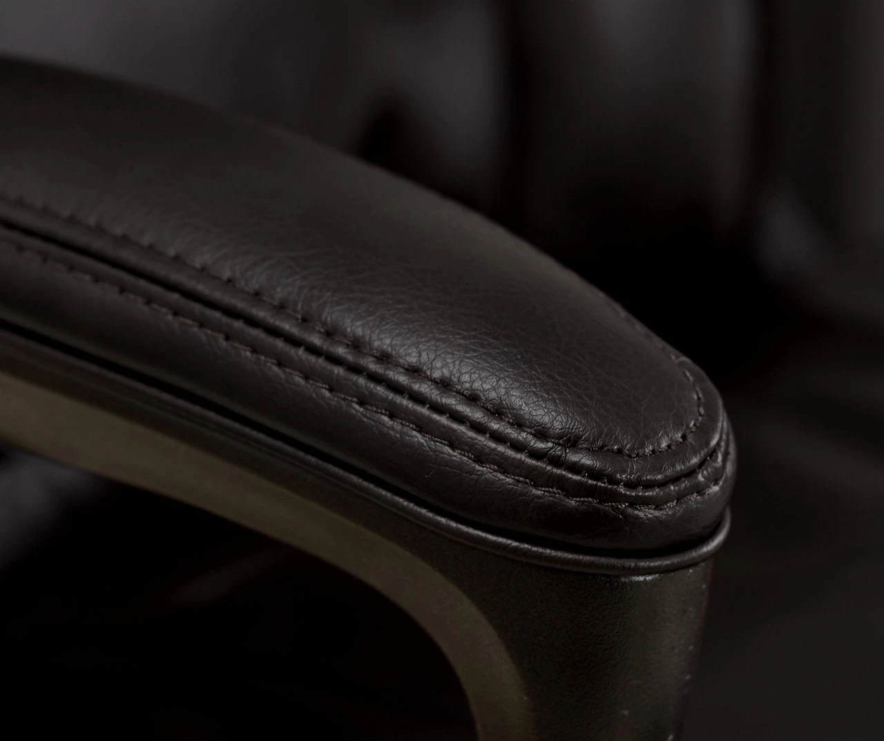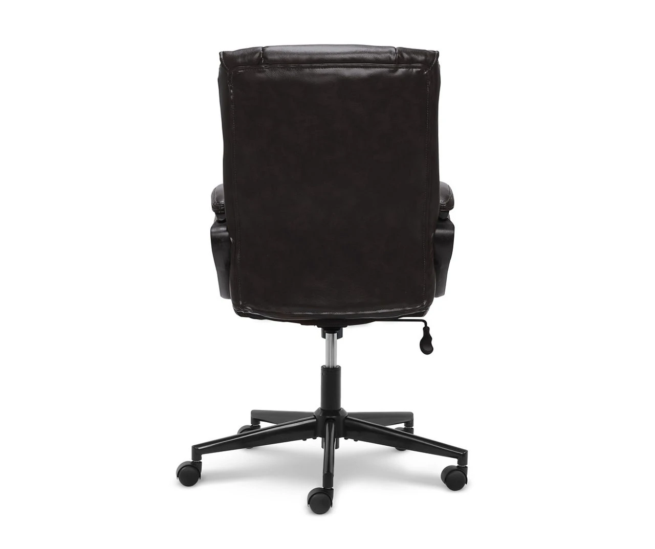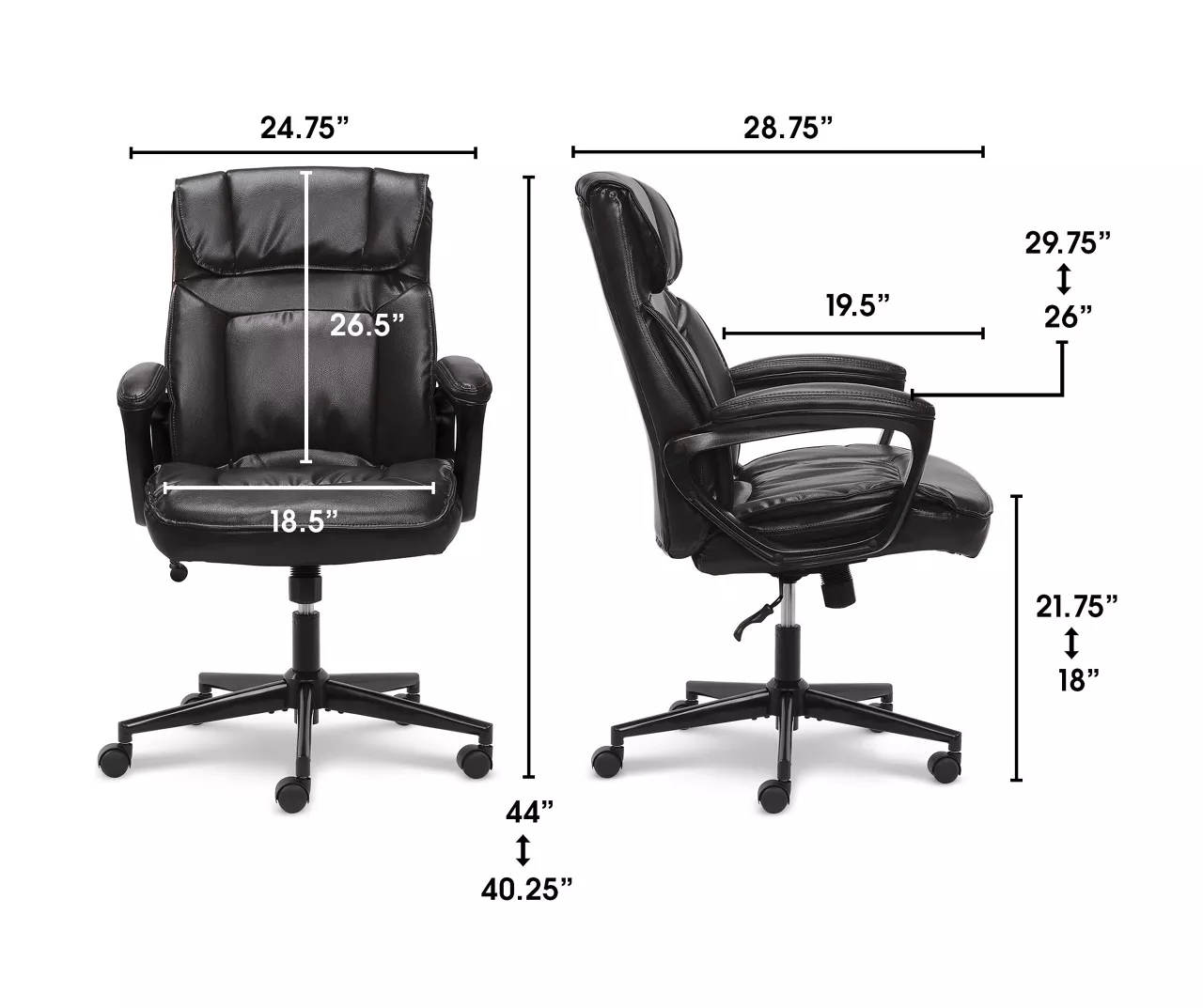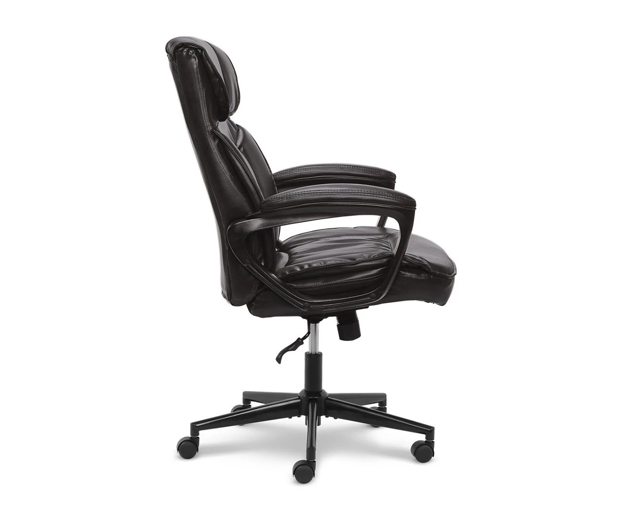 Get down to business in style with the bonded leather Hannah I office chair by Serta. With a cushioned, contemporary profile, its designed with comfort in mind with adjustable height and recline tensions. Its waterfall seat edge is curved to lessen back pressure and increase circulation. The design makes it suitable for many types of office decor, from modern to traditional. Its classic black cushions are accented by a black frame to improve any office’s decor aesthetic. The padded arms provide support and comfort, highlighting its ergonomic design. The sturdy 5-point base features castor wheels that are ideal for hard-surface floors.