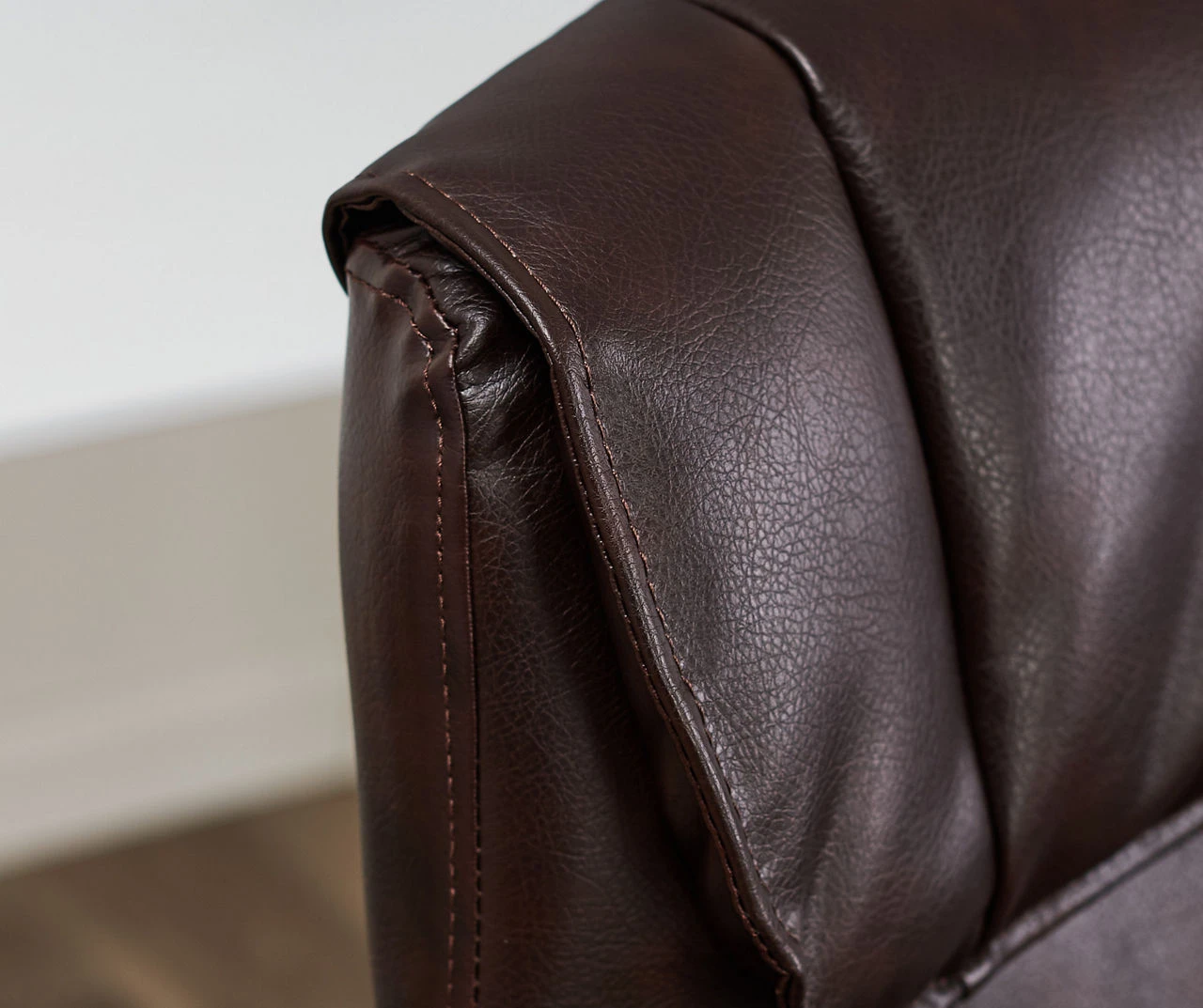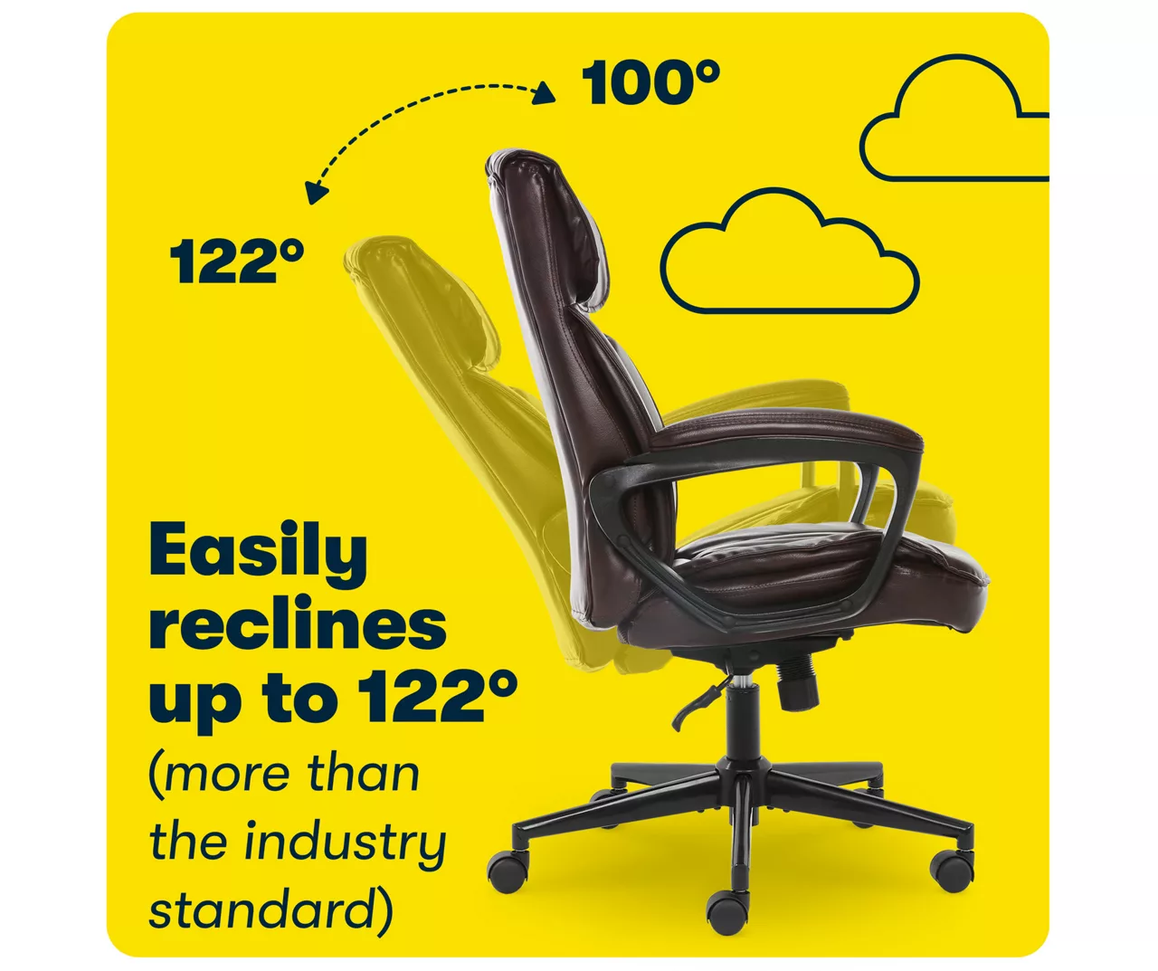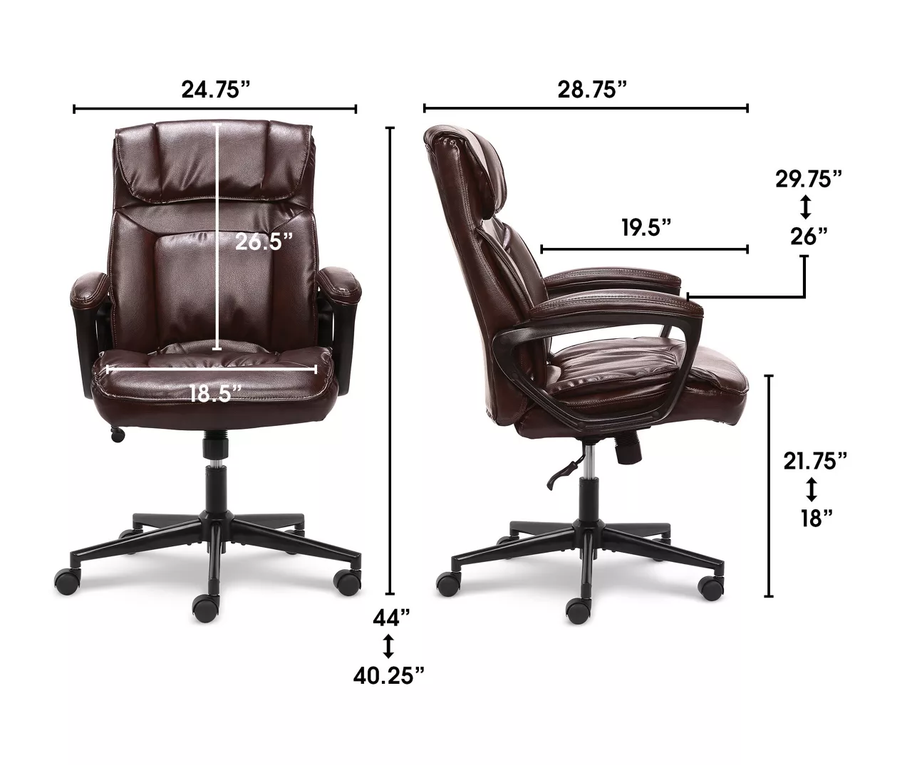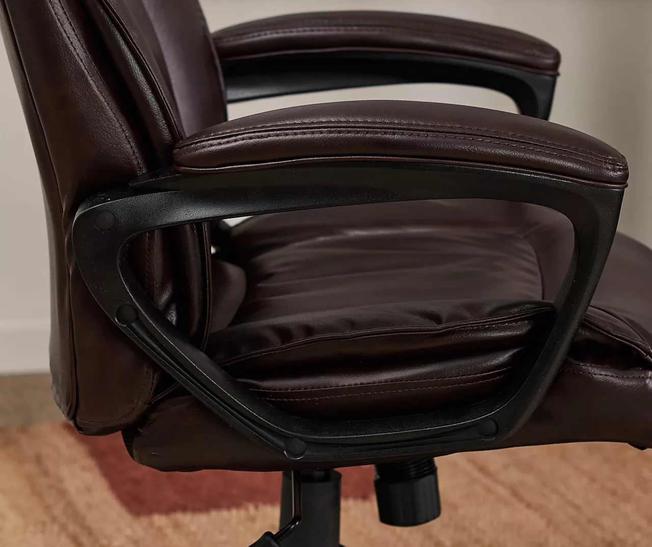 Get more done—and feel great doing it—in the Hannah I office chair by Serta. With a cushioned, contemporary profile, its designed with comfort in mind with adjustable height and recline tensions. Its waterfall seat edge is curved to lessen back pressure and increase circulation. The design makes it suitable for many types of office decor, from modern to traditional. Its classic brown bonded leather s accented by a black frame to improve any office’s decor aesthetic. The padded arms provide support and comfort, highlighting its ergonomic design. The sturdy 5-point base features castor wheels that are ideal for hard-surface floors.