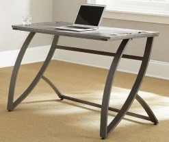The Hatfield desk is constructed of durable Silvershield laminate in a driftwood gray finish that resists heat, moisture and scratches. Featuring a dark metal base with durable powder coating, the unique tabletop is constructed with recessed areas for holding beverages and writing utensils on both sides of the desk, keeping all your necessities within reach.