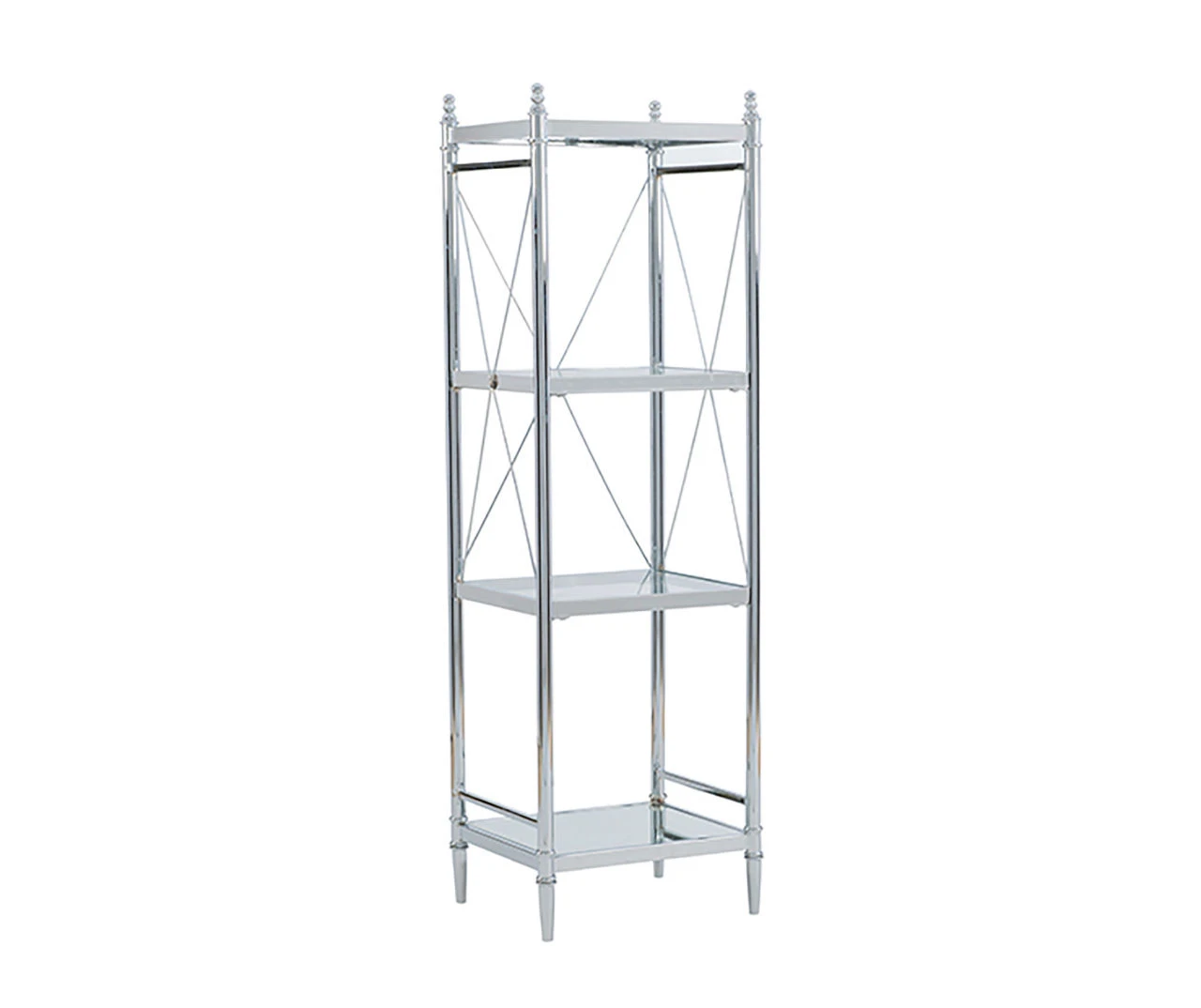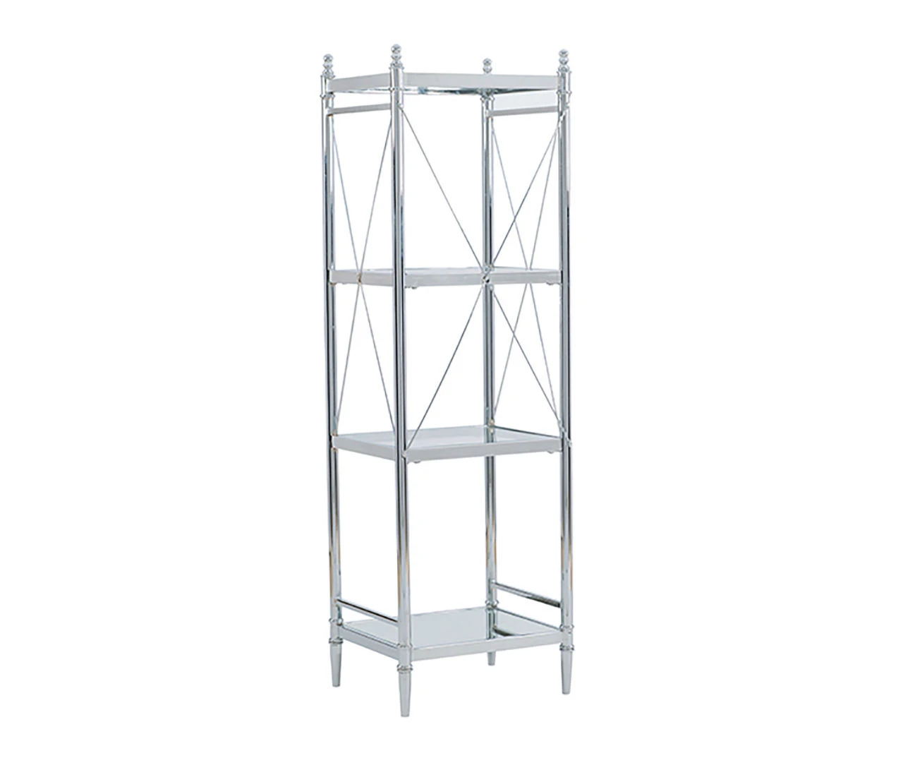 Glass shelves and a sleek chrome frame gives this versatile shelf a crisp, gleaming look. Perfect as a storage, display or entertaining piece, this table combines function with a classic, geometric design. Add it to a bathroom to keep linens and toiletries close at hand or as a bookcase in a home office. Creates a dynamic, stylish look in any room.