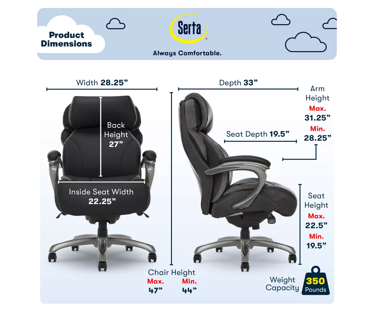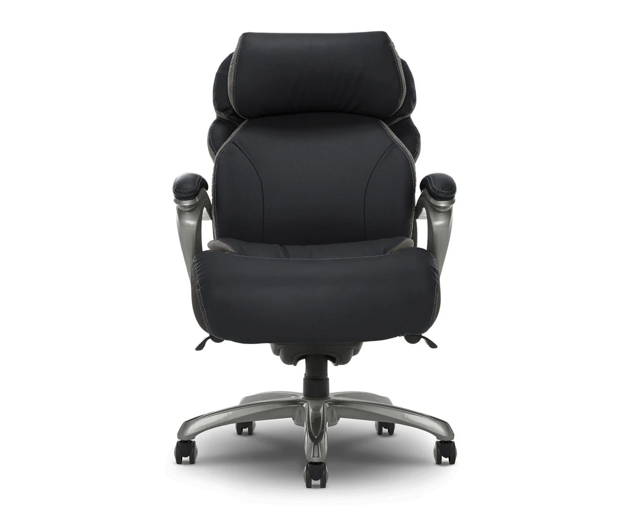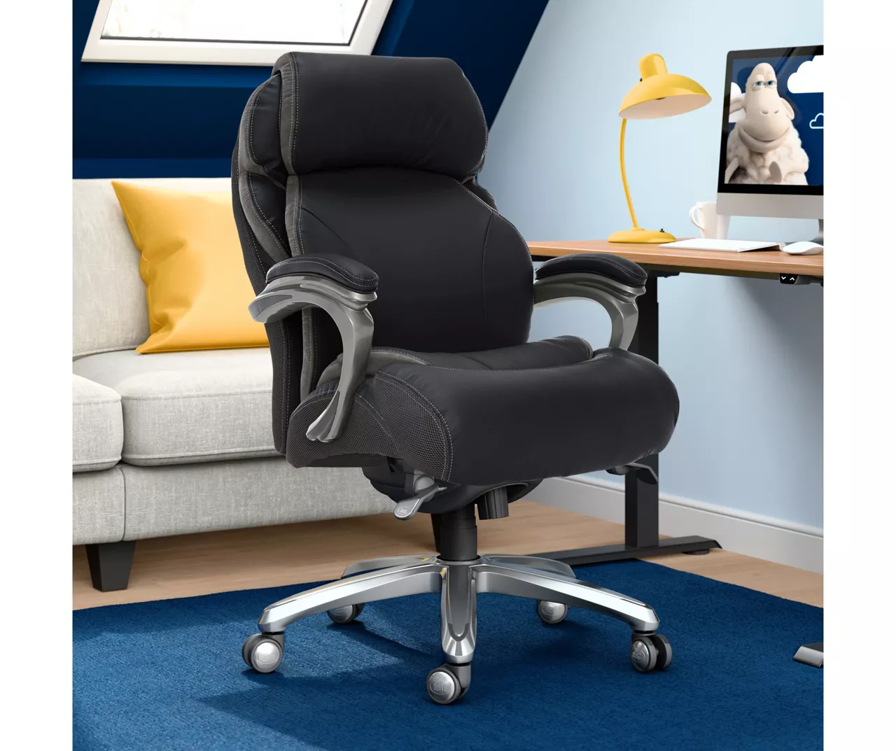 The Serta Big and Tall Smart Layers executive office chair with AIR technology brings you the quality, comfort and style you expect from a quality office chair. The innovative Serta Premium Elite five-layer cushioning system is strategically placed over individual pocketed ComfortCoils, providing adaptive comfort where you need it most. Designed to transform the way you work, this ergonomic office chair features an AIR lumbar zone that pivots and flexes, following your movements to provide you with superior back support that improves your posture. The easy-access adjustment controls let you customize your position, giving you a personalized seating experience that alleviates discomfort and minimizes stress. This Big and Tall office chair has a generous, roomy seating area so you can stay focused and productive without feeling constricted.