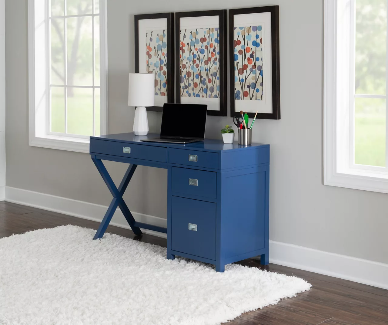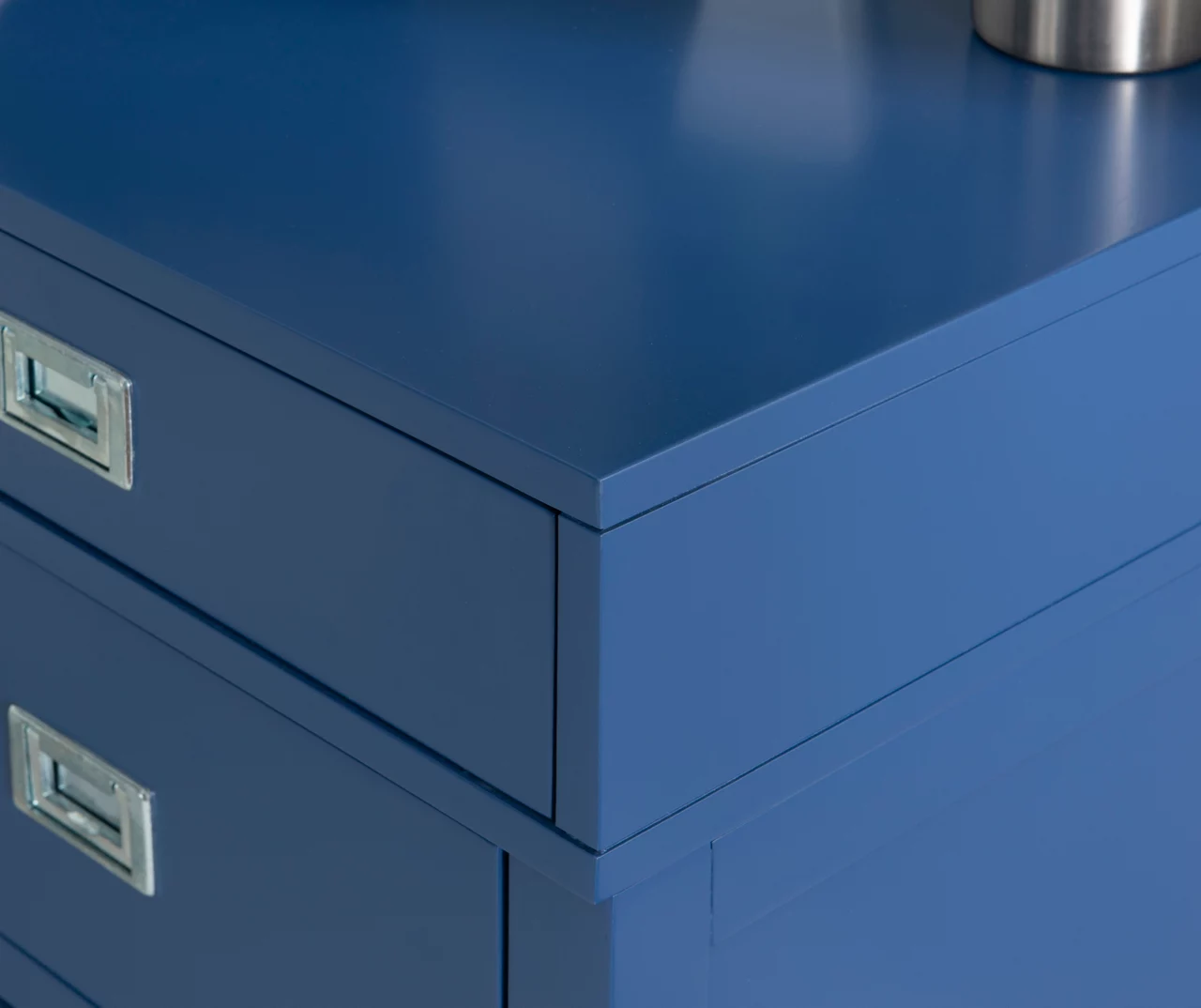 Gain new levels of control over your productivity and organization with this sleek desk and storage combination. The design provides an ample workspace without overcrowding your home office or bedroom. Three drawers and a larger storage drawer are seamlessly tucked under the desk and equipped with shiny silver metal handles. The modern blue finish pairs well with today’s cutting edge decor, but is subtle enough to blend with almost any other setting.