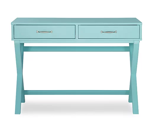 This campaign-style, two-drawer desk is the perfect option for any home, office or dorm room. The simple design and X-frame legs will save you space, while still providing plenty of room for your books, laptop, tablet or mail. The two drawers add additional storage space for things you’d like to keep tucked away. The smooth pastel turquoise finish will add a welcome pop of color to any space.