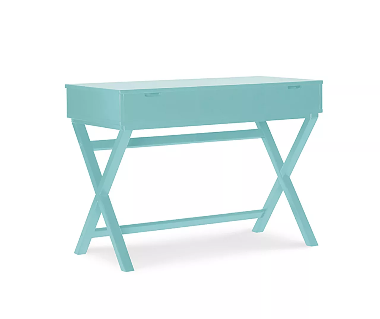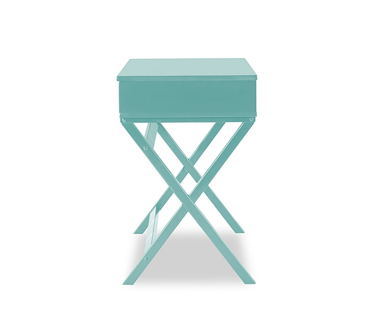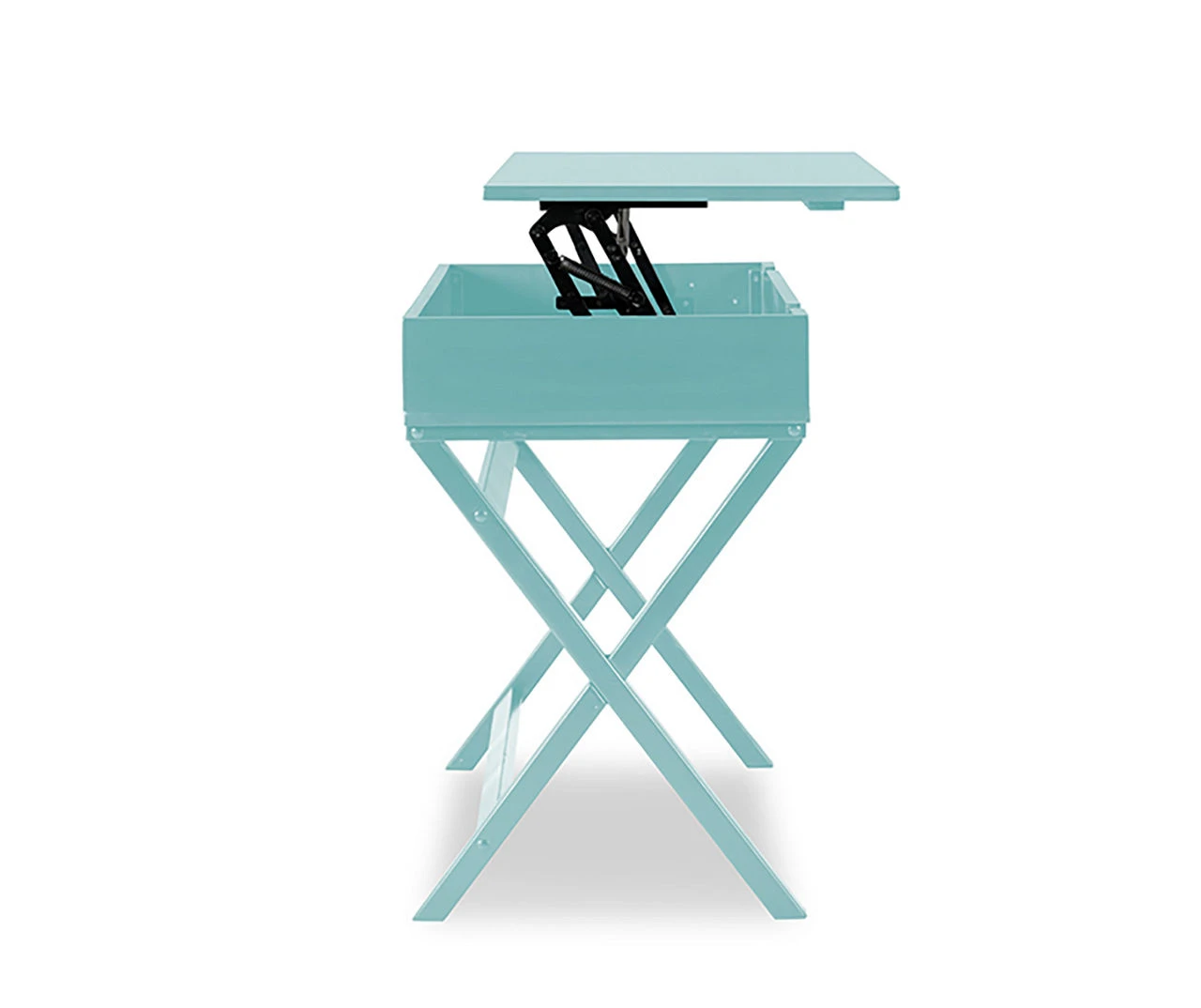 This campaign-style, lift-top desk is the perfect option for any home, office or dorm room. The simple design and X-frame legs will save you space, while still providing plenty of room for your books, laptop, tablet or mail. The lift-top provides tons of additional storage space for things you’d like to keep tucked away. The smooth pastel turquoise finish will add a welcome pop of color to any space.