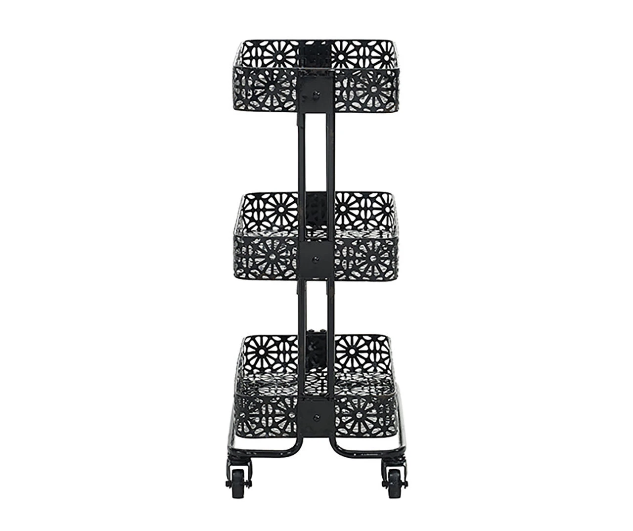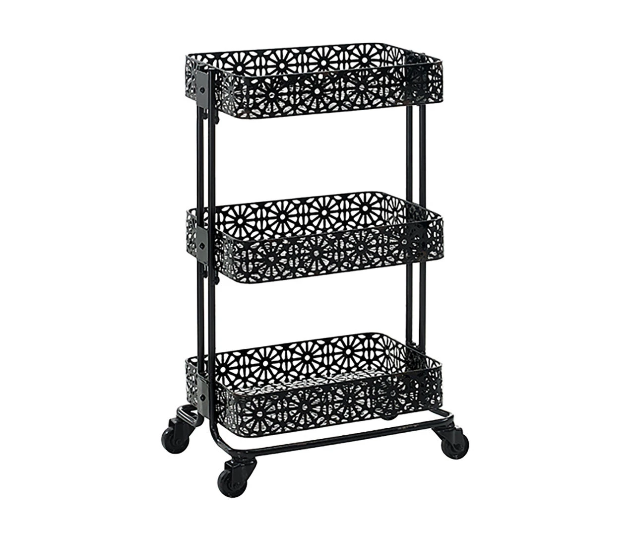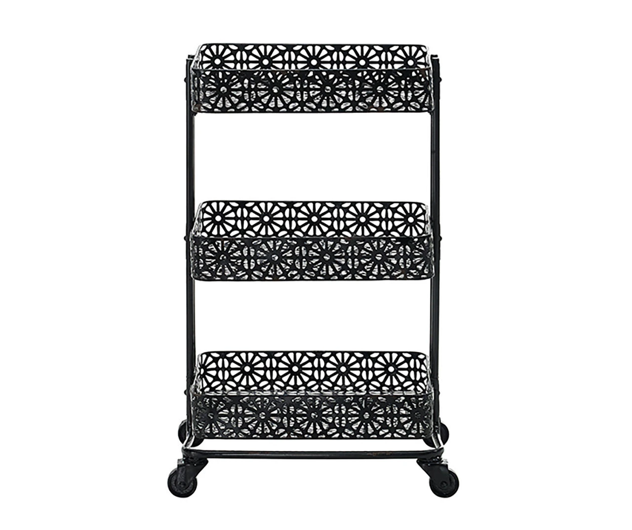 Add a functional piece to your kitchen, sunroom or living space that delivers loads of charm as well. Three distressed metal shelves feature a pierced floral motif while durable casters make it easy to move wherever needed. Use the tiered cart to serve snacks, keep linens organized or create a storage area for home crafts.