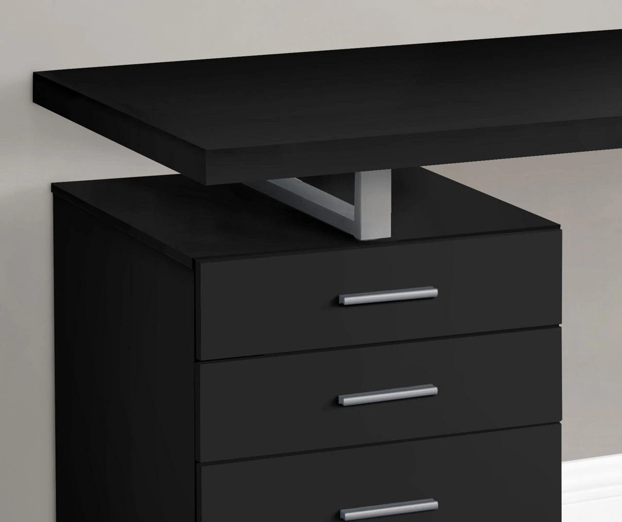 With three drawers and a thick floating desk top, this computer desk is made for productive days working from home. The thick-panel floating desktop provides room for the essentials allows you to use the top of the drawer unit as an extra surface. Finished in the same light reclaimed wood-look laminate as the desktop, the drawer unit includes two small drawers and one large drawer with a bar for hanging files. The base can be installed on the left or right side according to your preference.