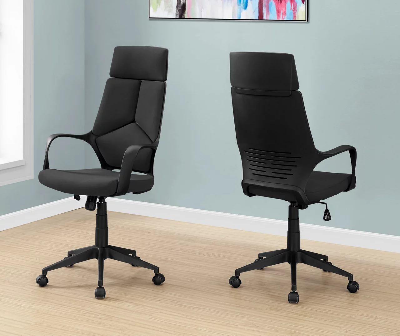 Increase your productivity with this chic and contemporary high back black executive office chair. This functioning swivel office chair is upholstered in a sleek and breathable black faux leather fabric with brown accents, offering thick padding in all the right spots for ultimate comfort. The cushioned seat is adjustable to your desired height with a tilt back lock-in mechanism. The sturdy metal base with capped five nylon castors smoothly glides across the floor for easy mobility. This stylish and easy to assemble executive chair gives a fresh new look to any office space.