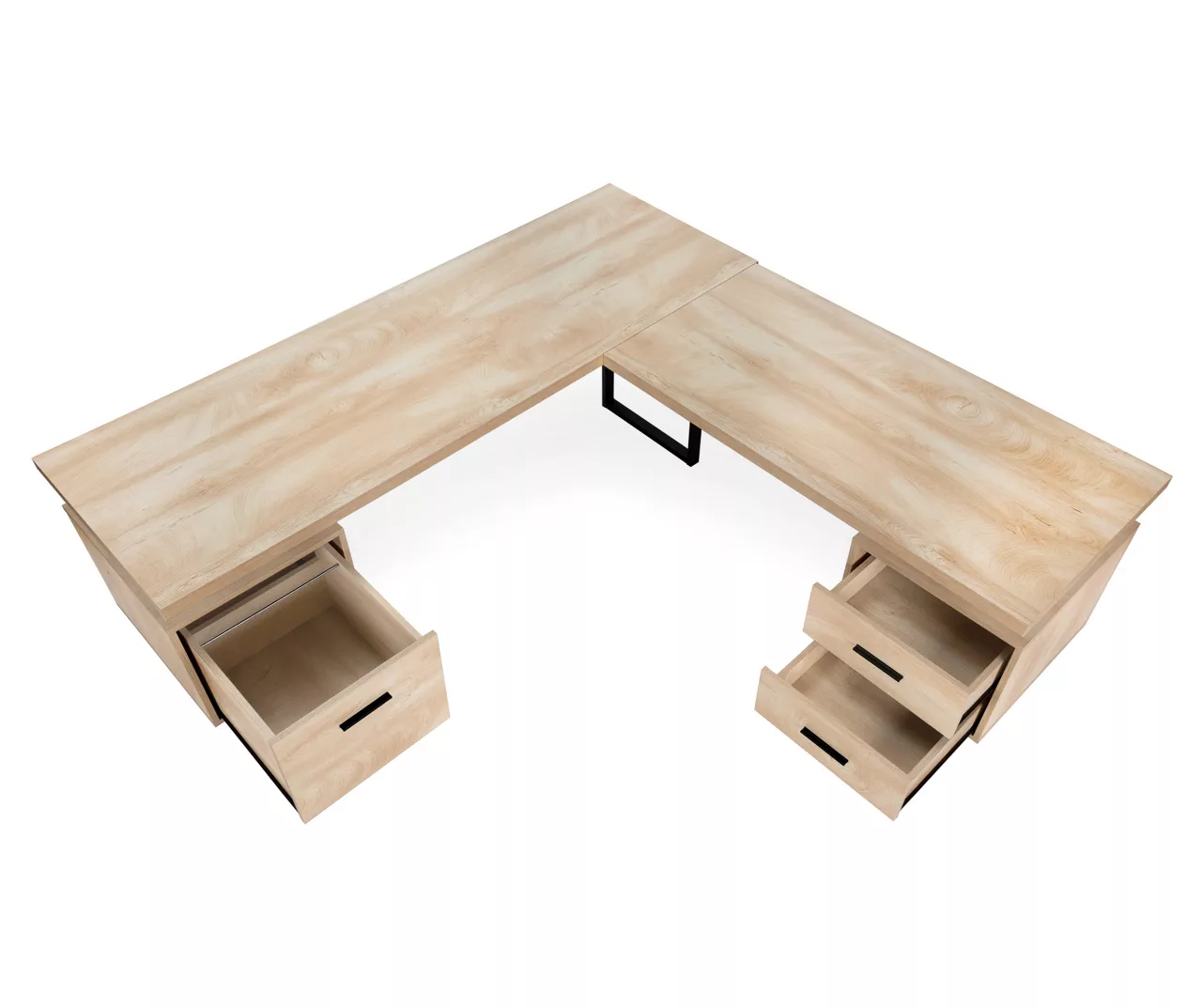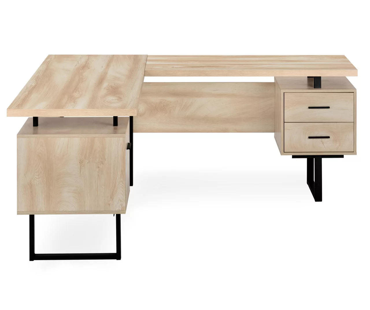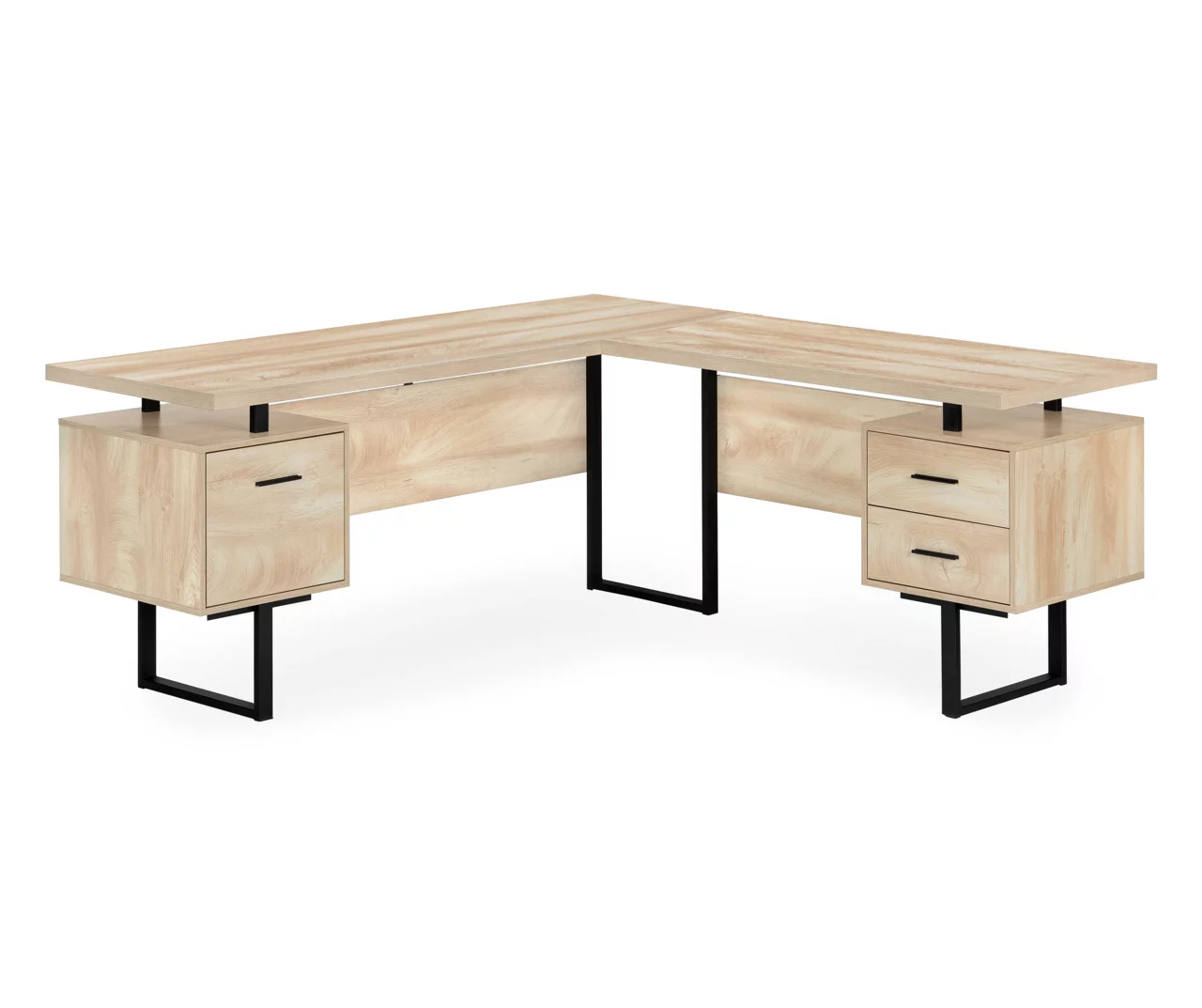 Give your home office a promotion with this extra-large, corner desk. The L-shaped, floating desktop is generously sized and leaves space to use the tops of the drawer units as shelves. A reversible configuration lets you set up the desk with the drawer units on either side as desired. The space between the three storage drawers allows ample room to easily move around your workspace. Providing support are robust metal legs in a black finish that matches the drawer handles. This L-shaped computer desk saves space when used in a corner, but is finished on all sides for a polished look wherever it is placed in a home office.