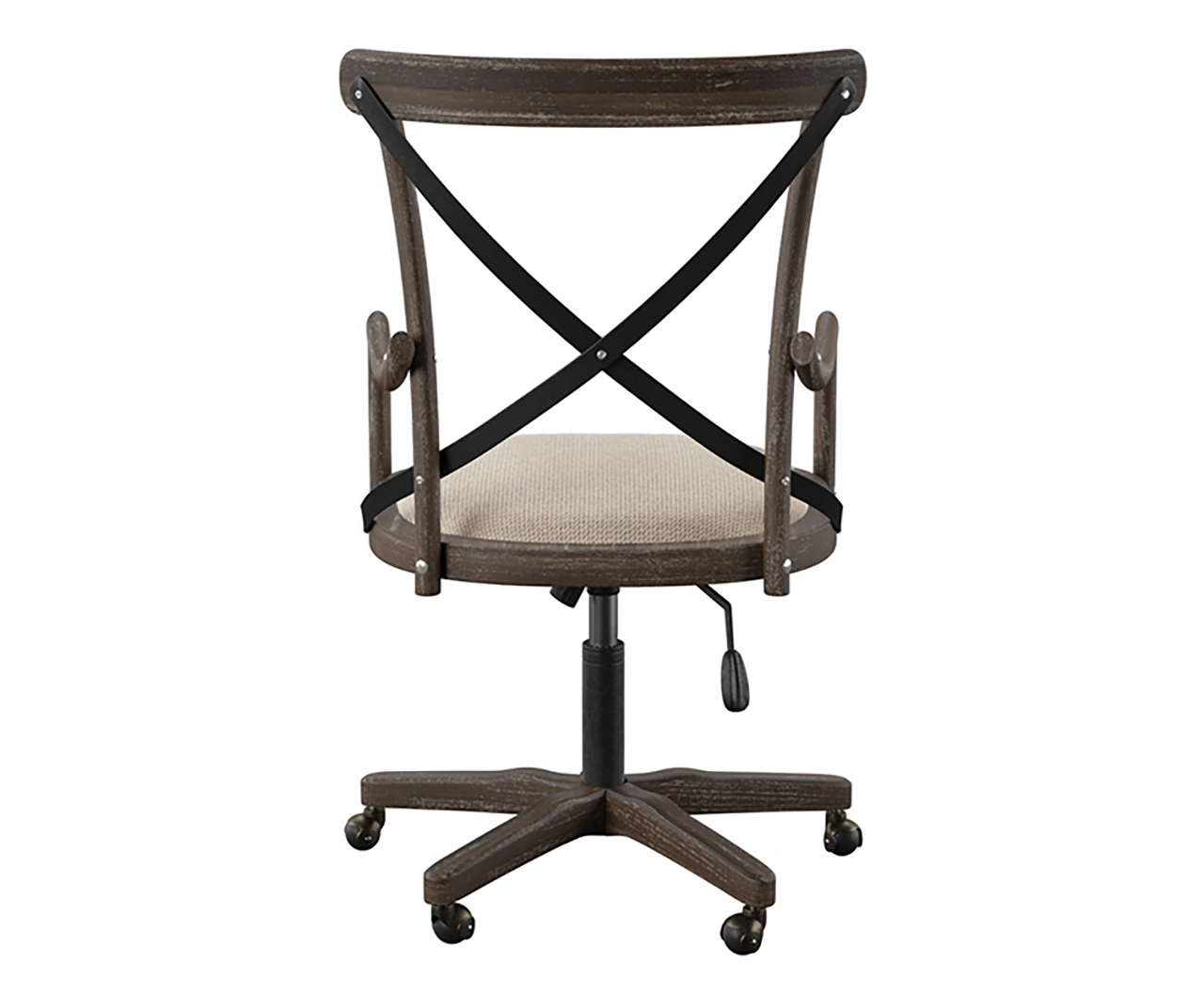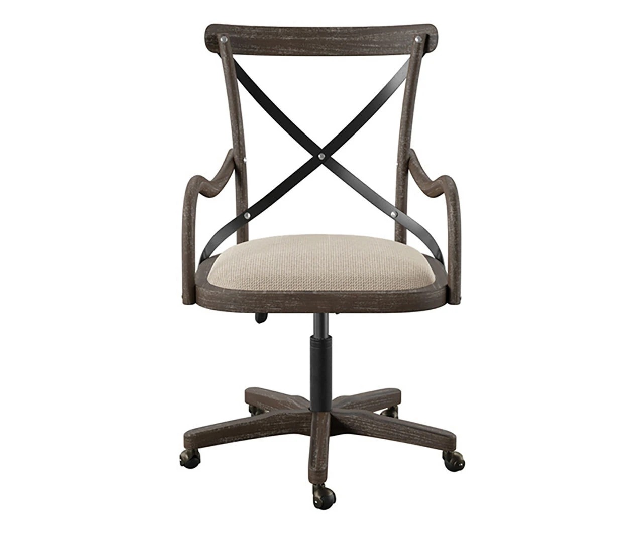 Inject a rugged yet sophisticated look into your office with this handsome chair. A black metal X-back design adds an industrial touch to the rustic wood frame while the padded, upholstered seat offers comfort for a long work day. With durable metal casters and adjustable height design, this chair offers the function and versatility to suit any busy office.