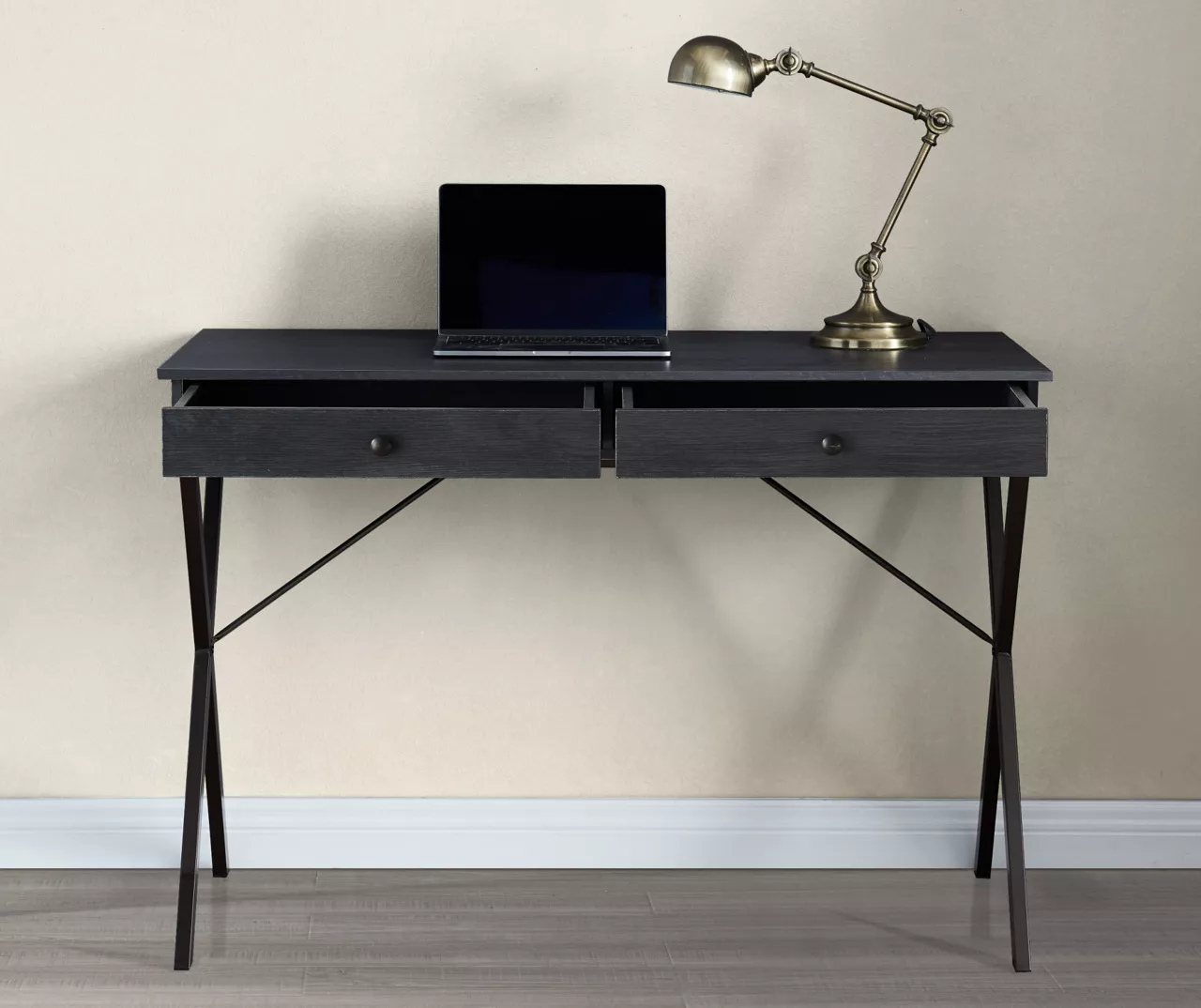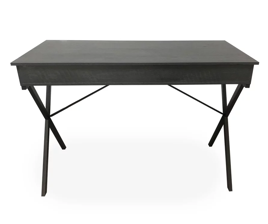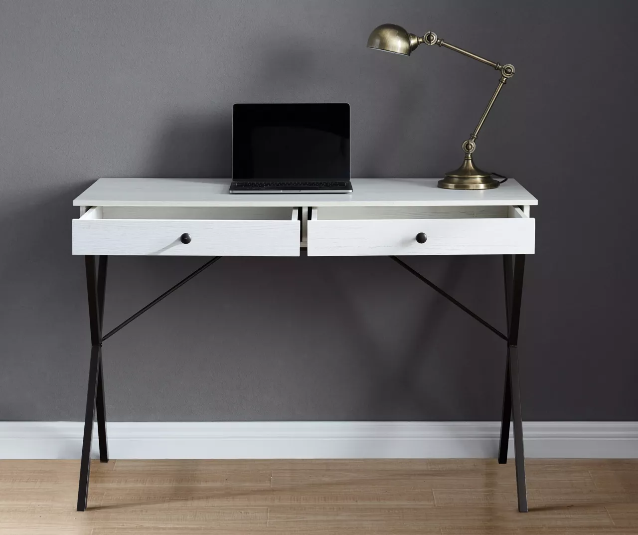 Bring countryside charm to your workspace with this Real Living writing desk. Designed with a wood crafted top and crossing metal legs, the desk features two drawers with decorative round knobs that are perfect for storing papers, writing utensils or supplies. Functional with style, it’s a great addition for the home office, living space or study.