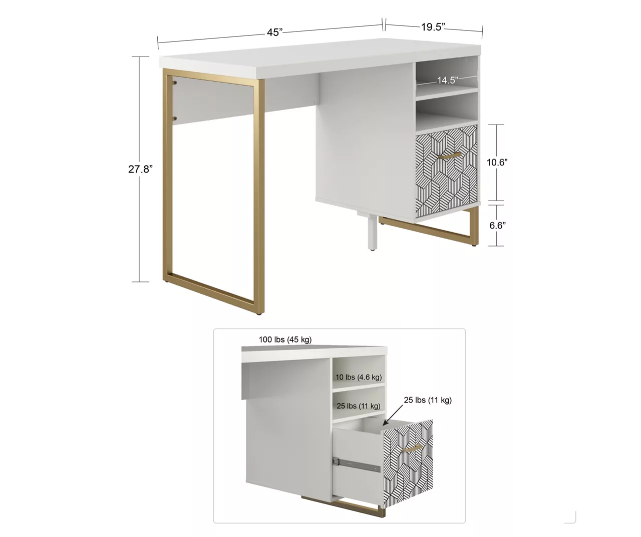 Bow down to the CosmoLiving Scarlett single pedestal desk. Designed with a modern silhouette, the pedestal desk comes in a crisp white finish. The Scarlett is built on durable gold metal legs with a roomy patterned drawer to store your things and two open shelves to obsessorize. Made with your organizational desires in mind, this desk is a match made in home office heaven.