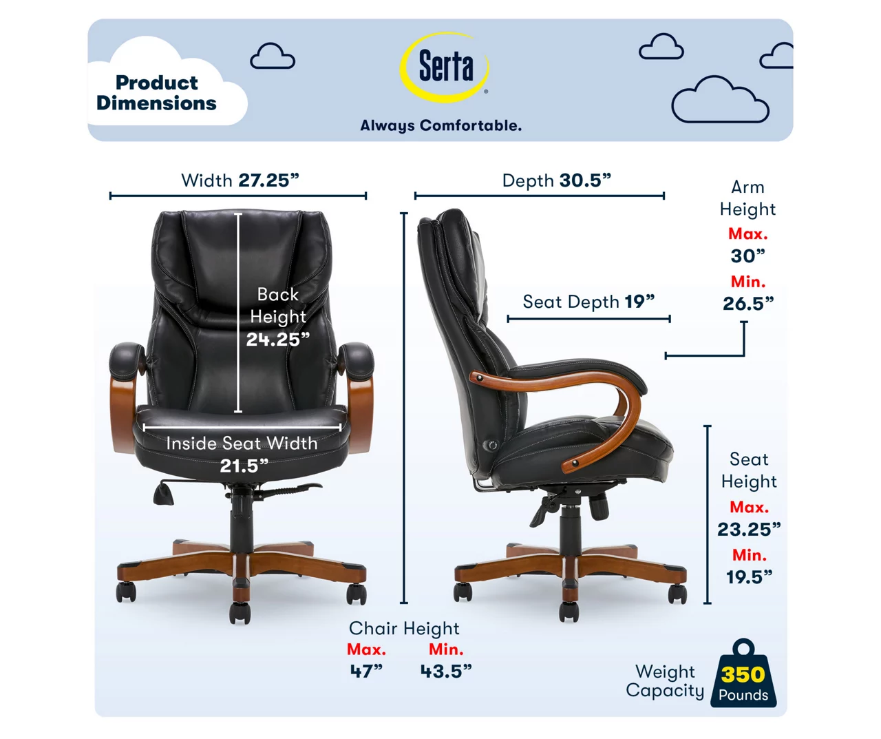 Create a powerful and commanding presence in your office with the Serta Big and Tall Executive Office Chair. This corporate office chair is specifically designed to deliver proper strength and support for those with larger frames. It features an adjustable lumbar panel that provides the support you need for long hours at the office, with ergonomic height and tilt adjustments that let users find and lock in the perfect position. Quality bonded leather and authentic wood accents exude an executive presence, while layers of thick, pillowy cushions offer first-class comfort. Strong, sturdy, and dependable, this adjustable leather office chair makes a confident statement while keeping you comfortable and supported.