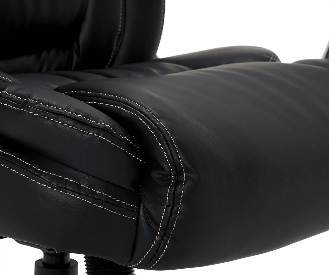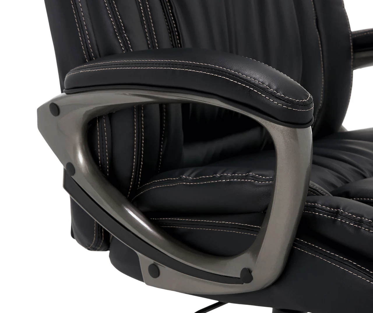 Bring relaxation to your busy workday with the Serta Executive Office Chair. Serta kept comfort in mind while designing this desk chair with luxurious layered body pillows, a contoured lumbar zone and padded armrests for all day ease and exceptional support during long periods of sitting. The waterfall seat edge reduces pressure on the back of the legs and increases circulation, which helps decrease fatigue while seated. The ergonomic office chair features both recline and seat-height adjustment settings, allowing you to find your optimal seating position. The heavy-duty painted base with scuff-resistant foot pads is designed for long-lasting, reliable use. This desk chair is upholstered in supple bonded leather with contrast stitching for comfort and style in any workspace.