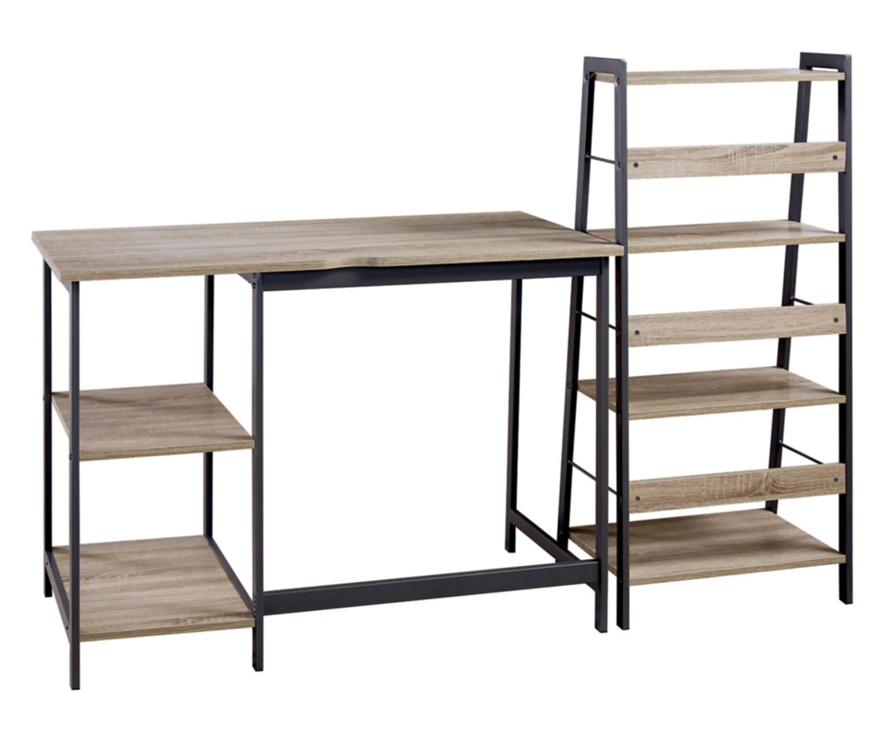 Make it work in high style with this laptop desk with bookcase. This two-piece set comes with a sleek desk with two shelves to hold your desktop or a printer, while you can use the four-shelf bookcase to hold textbooks or reference materials. A reclaimed wood finish gives the modern, open-concept design a warm, homey feel.