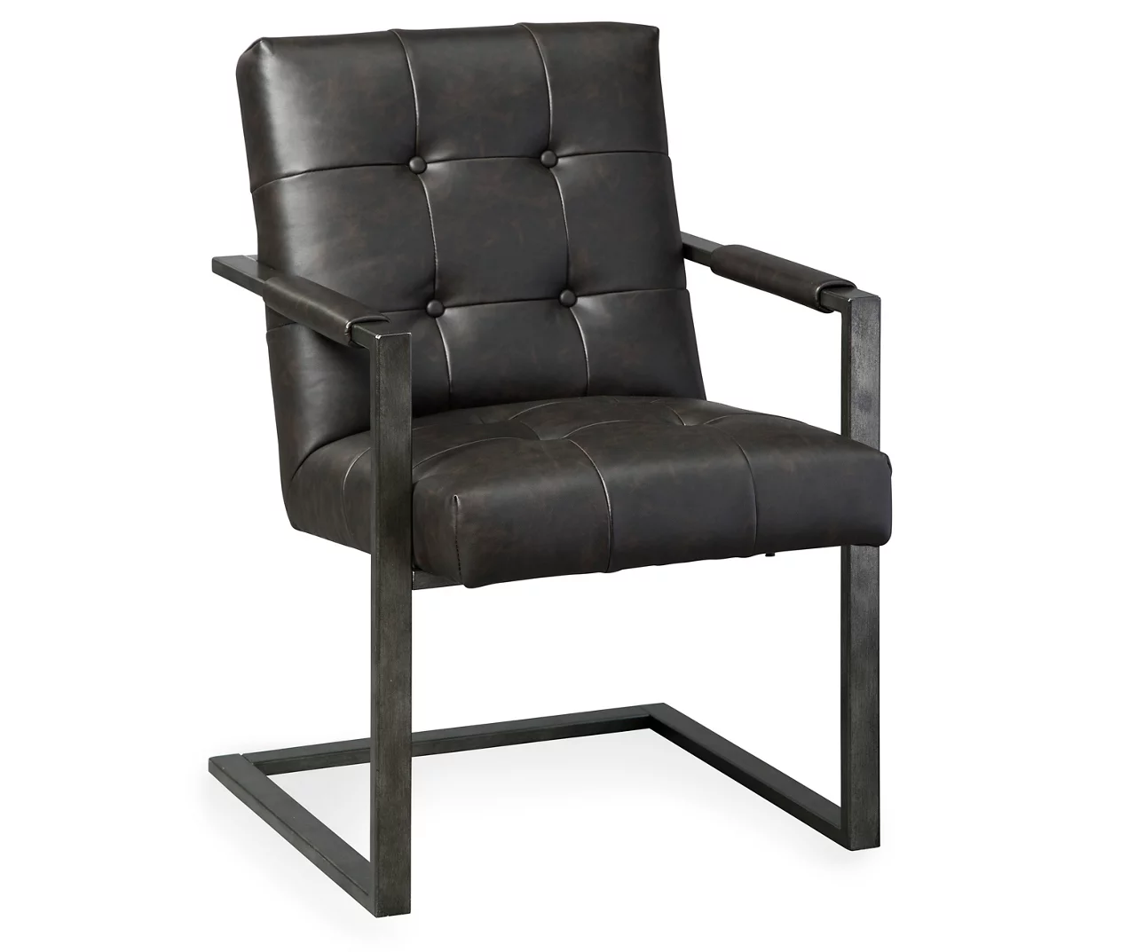 For fans of urban industrial design, this chair steals the show. The metal C-frame in a blackened gunmetal finish is sleek, sculptural and ultra modern. Crafted for looks and comfort, the tufted boxed seat, wrapped in a “weathered” faux leather upholstery, is loaded with retro chic flair.