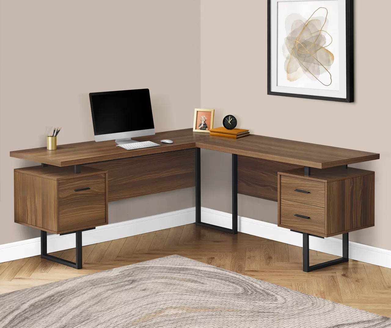 Give your home office a promotion with this extra-large, corner desk. The L-shaped, floating desktop is generously sized and leaves space to use the tops of the drawer units as shelves. A reversible configuration lets you set up the desk with the drawer units on either side as desired. The space between the three storage drawers allows ample room to easily move around your workspace. Providing support are robust metal legs in a black finish that matches the drawer handles. This L-shaped computer desk saves space when used in a corner, but is finished on all sides for a polished look wherever it is placed in a home office.