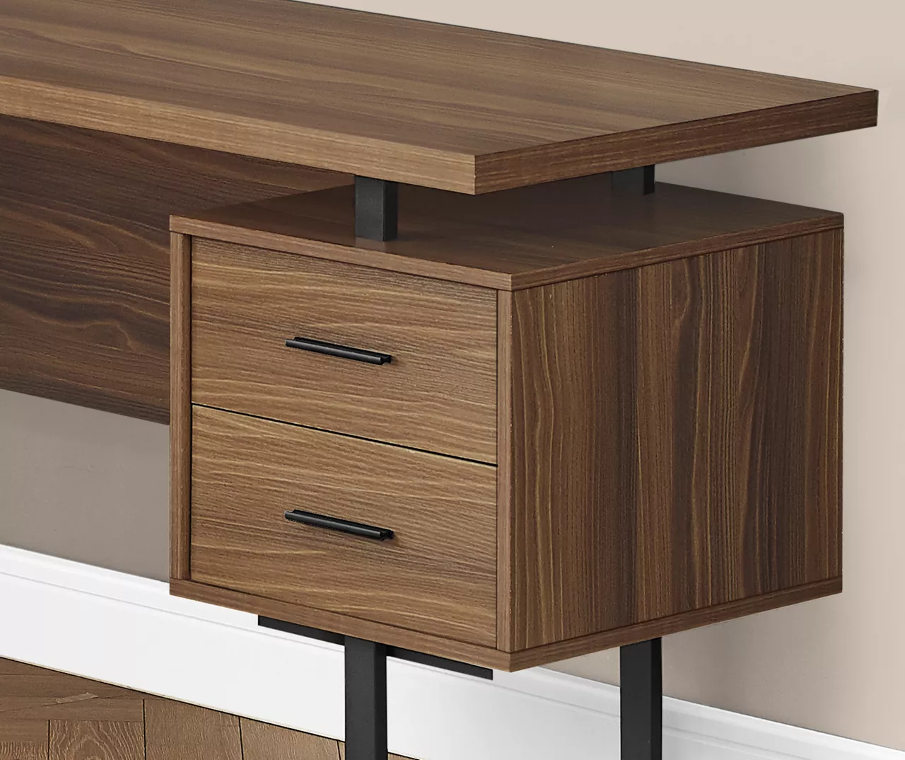 - Walnut wood-look finish tabletop, drawers and paneling