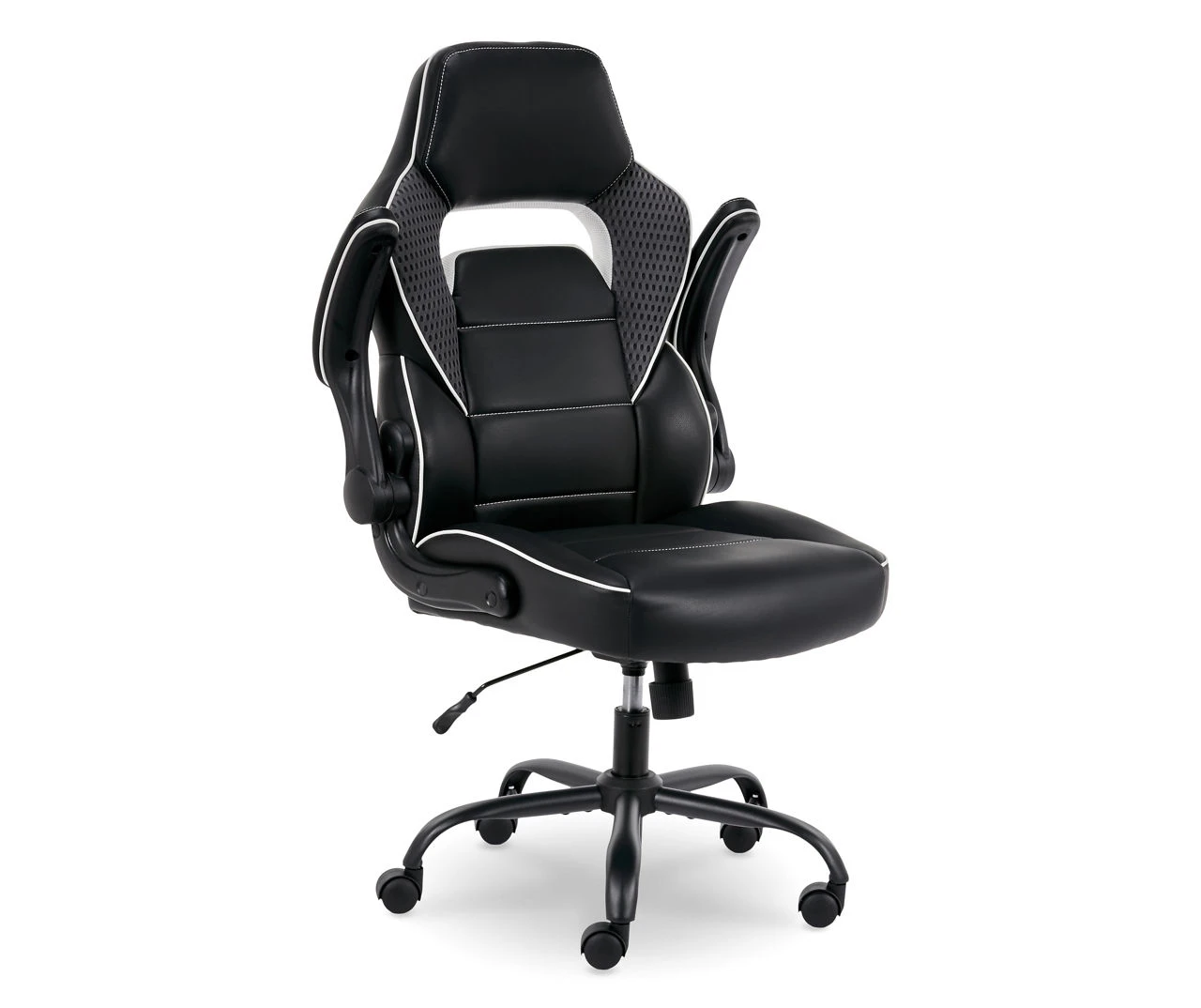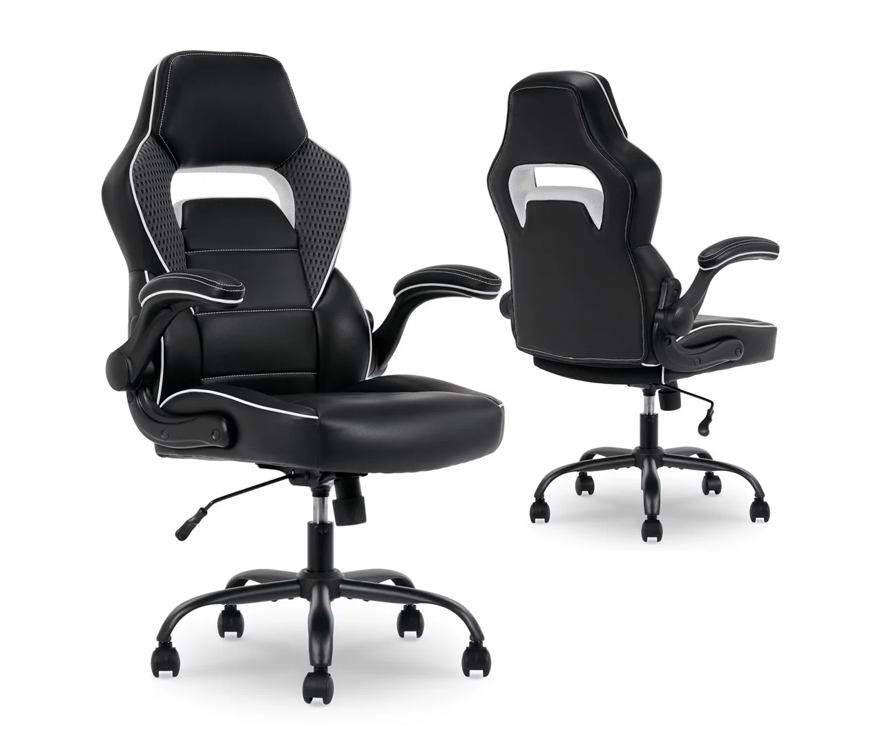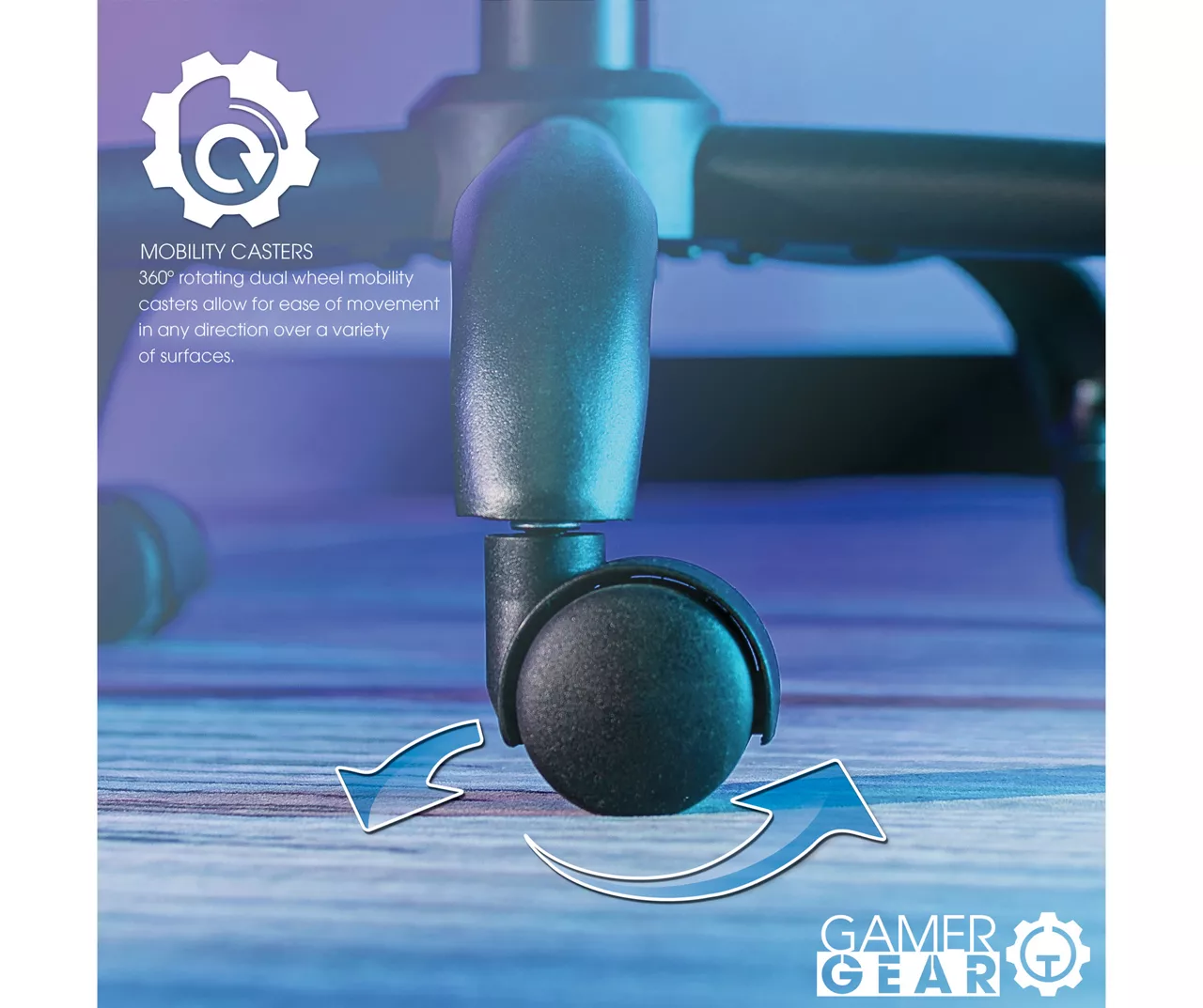 Look no further than this gaming chair from GamerGear. Covered in a ComfortSoft faux leather with mesh accents and contrast piping, this chair is built for comfort and style. The space saving flip-up arms with padded armrests give you plenty of room to move, while the five-star base with dual-wheel 360° mobility casters let you navigate your space with ease. The waterfall seat edge promotes healthy circulation by reducing pressure on back of leg. Pneumatic height adjustments customize your chair to fit your needs, whether you’re gaming, working or just relaxing. And with tilt tension adjustment and tilt lock-out features to meet the perfect position for your body and avoid discomfort during those long gaming sessions.