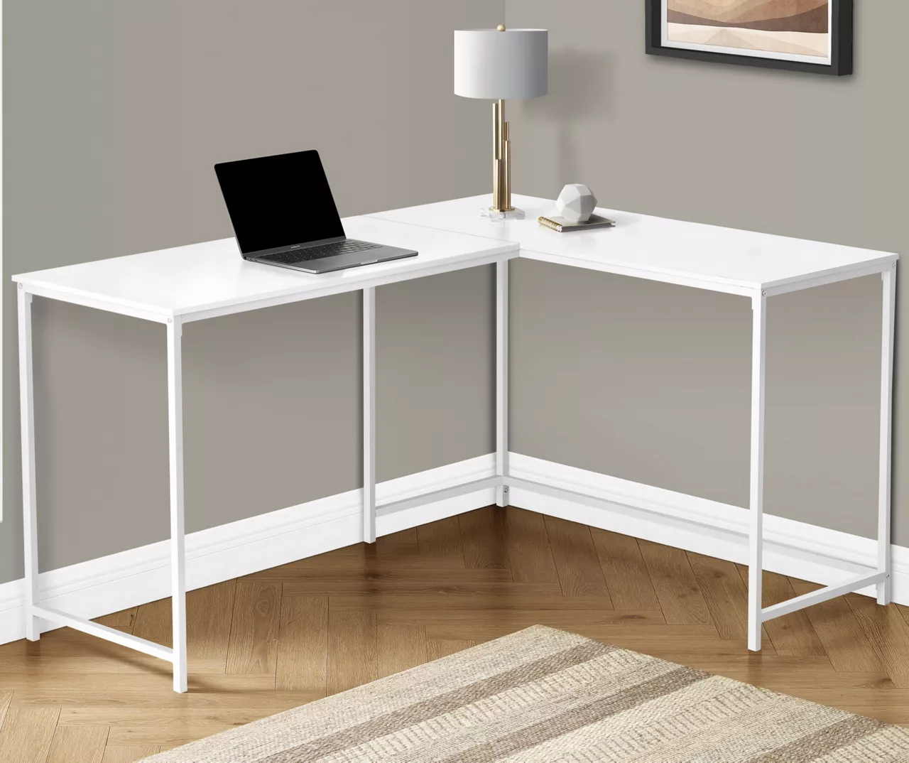 Delivering the best of both worlds, this L-shaped computer desk is both spacious and compact while accommodating everything you need for productivity. With its L shape, this desk won’t take up too much space when placed in a corner but is finished on all sides so you can position it however you choose in a home office. Both the desktop panels have a white finish and the black metal base is slender yet sturdy, giving this desk a modern simplicity that coordinates with most décors.